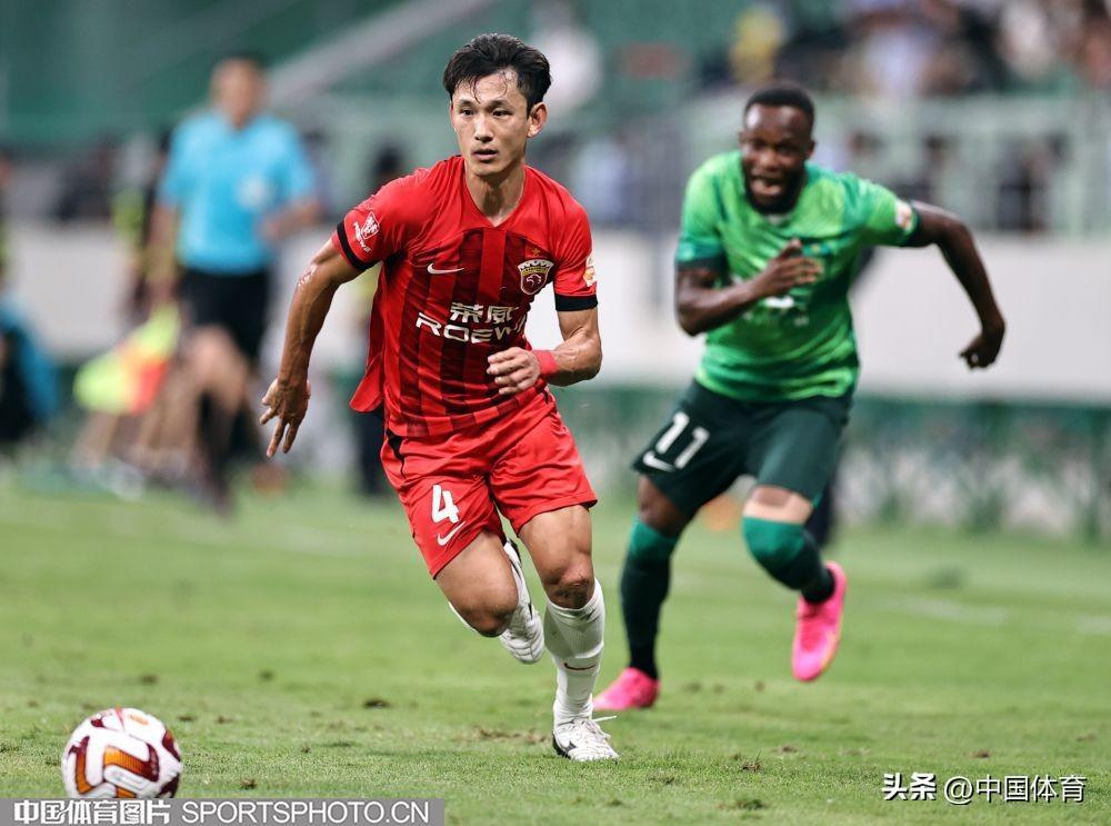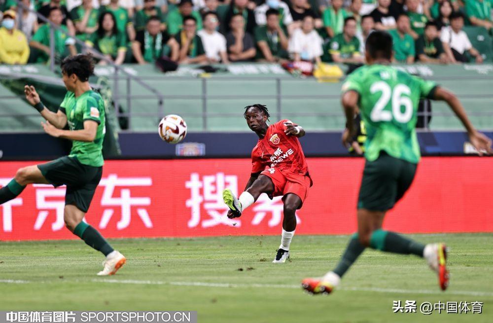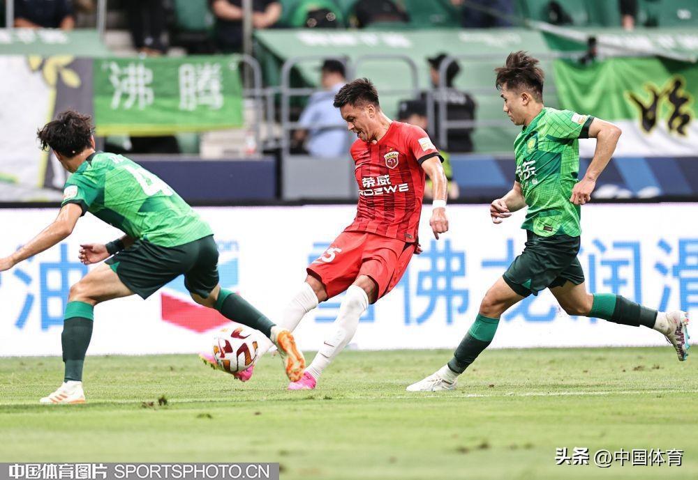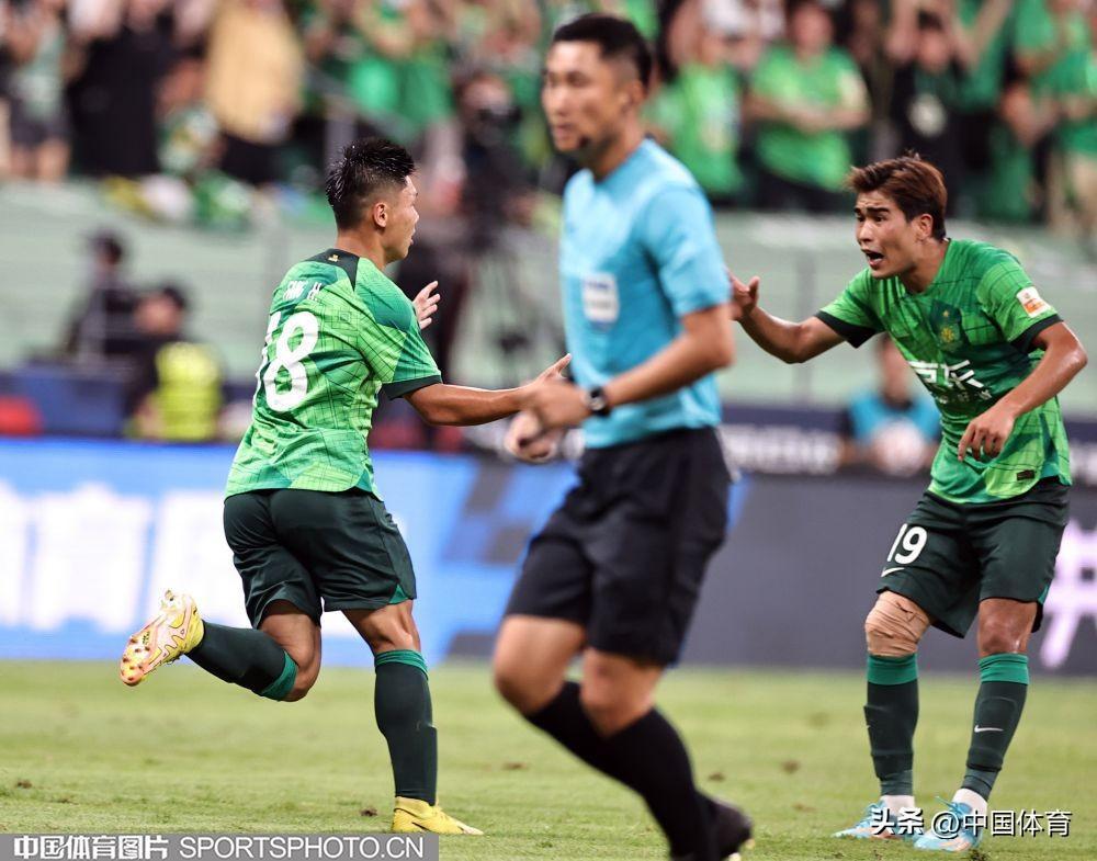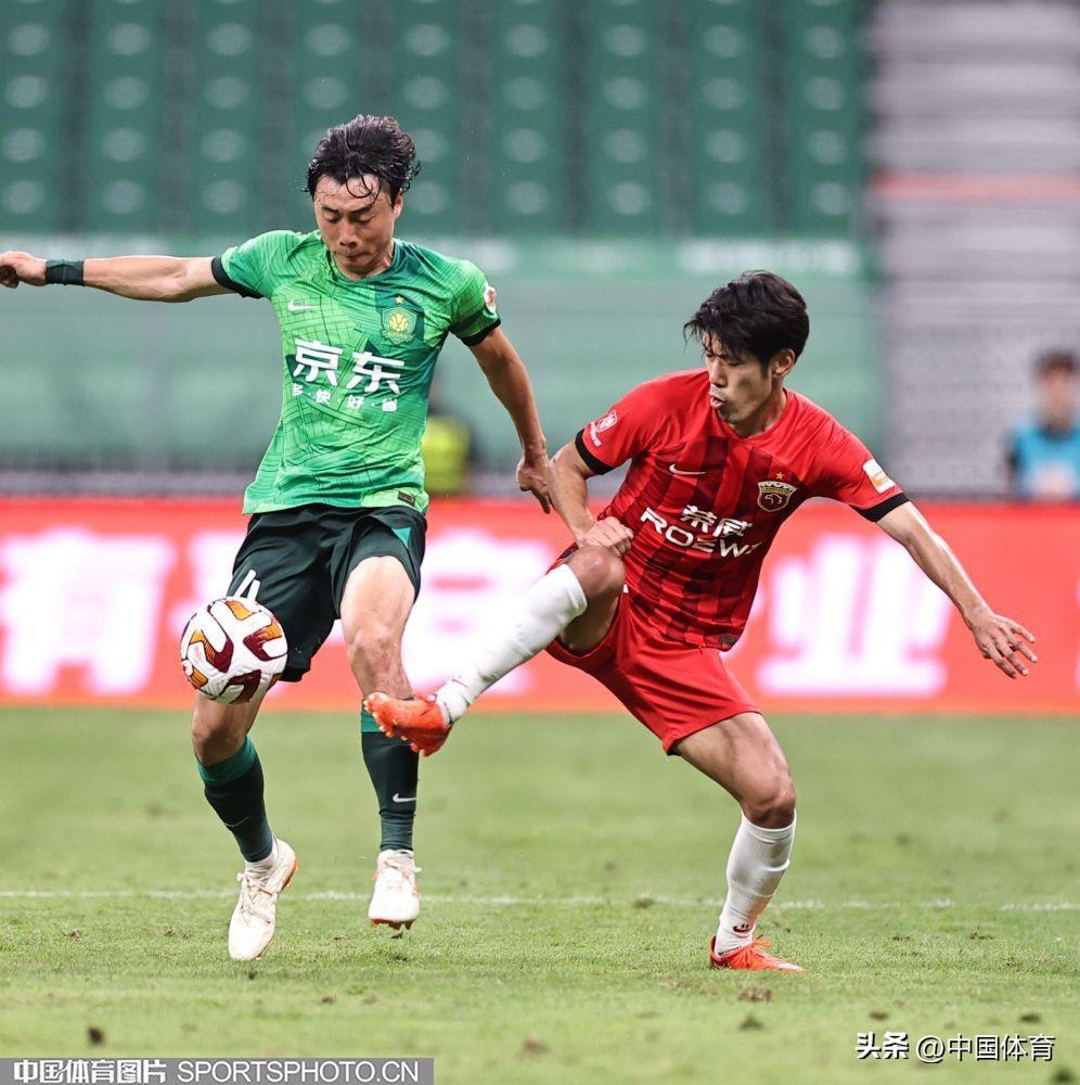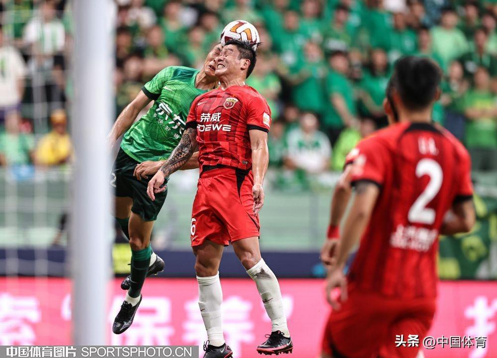 中國體育訊 6月29日,2023賽季中國足協超級聯賽繼續第十三輪爭奪。在北京工人體育場,主場作戰的北京國安隊(綠衣)以1比2負於上海上港隊(紅衣)。上半場,北京國安先入一球,但裁判組判罰越位在先。隨後,呂文君破門得分,助力上海上港隊1比0結束上半場戰鬥。易邊再戰,上海上港隊由買提江擴大戰果。第80分鐘,方昊把握住機會,爲北京國安扳回一球。(中國體育圖片 王憲民 攝)