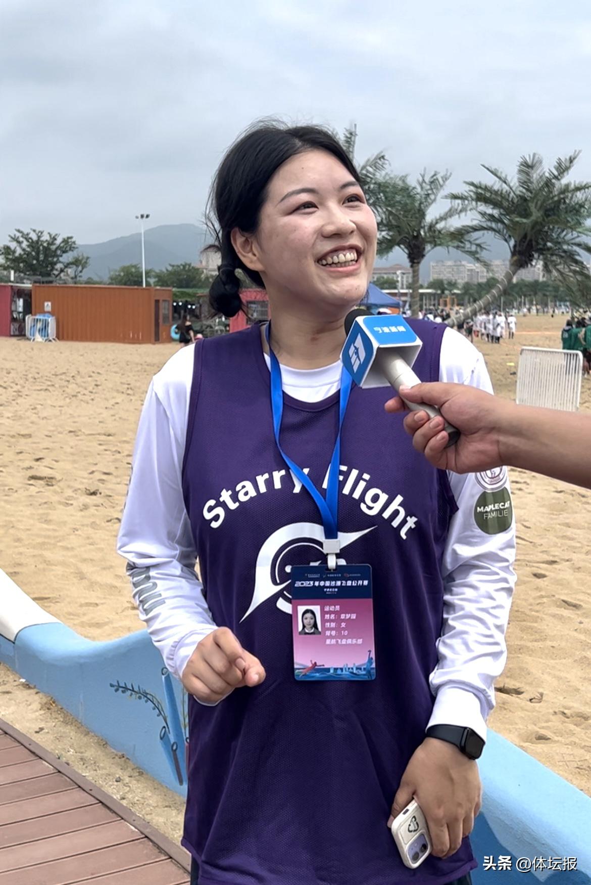 正如盧昌偉所說,飛盤是一項“新手友好”項目。星航飛盤俱樂部的章夢園接觸飛盤不過半年時間,自稱還處於“萌新狀態”,但已經參加了多次競技飛盤比賽。“接觸飛盤運動之後,感覺自己變得更陽光了,更願意出來參加活動,在太陽底下拼命奔跑。”在章夢園眼裏,飛盤運動最大的魅力在於它的社交屬性,每當作出一個非常好的傳盤,或者和隊友配合默契,都讓她感到愉悅。作爲寧波本地人,對這場家鄉舉辦的賽事,章夢園表示十分滿意。“我們隊裏大部分是北京航空航天大學校隊成員,因爲酒店和接駁車安排得很方便,所以從北京來的選手也能很快地適應場地,提供給我們的各種補給和賽事包也都是很好的。”