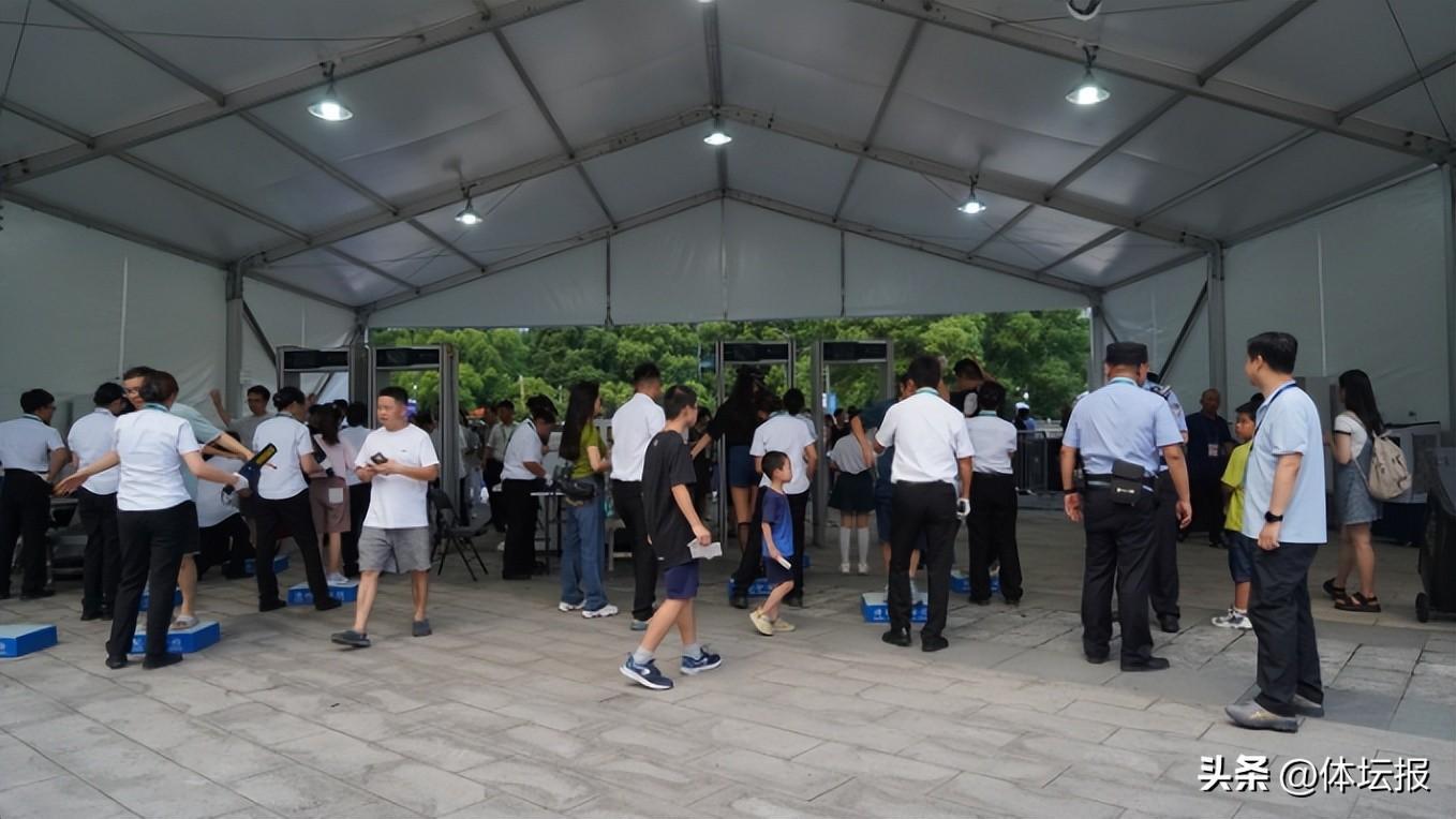 爲避免人員集中,本次賽事設置了兩個安檢口,觀衆安檢口設在錢潮路上,其他人員安檢設在富春路上。下午6點半,入場觀衆漸漸增多,10個安檢通道進入緊張忙碌時段。但再忙碌安檢流程也不能馬虎,禁帶、限帶物品都進行了仔細檢查,部分觀衆攜帶的諸如水杯、瓶裝飲料都被禁止帶入。杭州採荷中學的洪翰宇與爸爸一起來看比賽,在安檢口自己攜帶的飲料被告知無法進入。