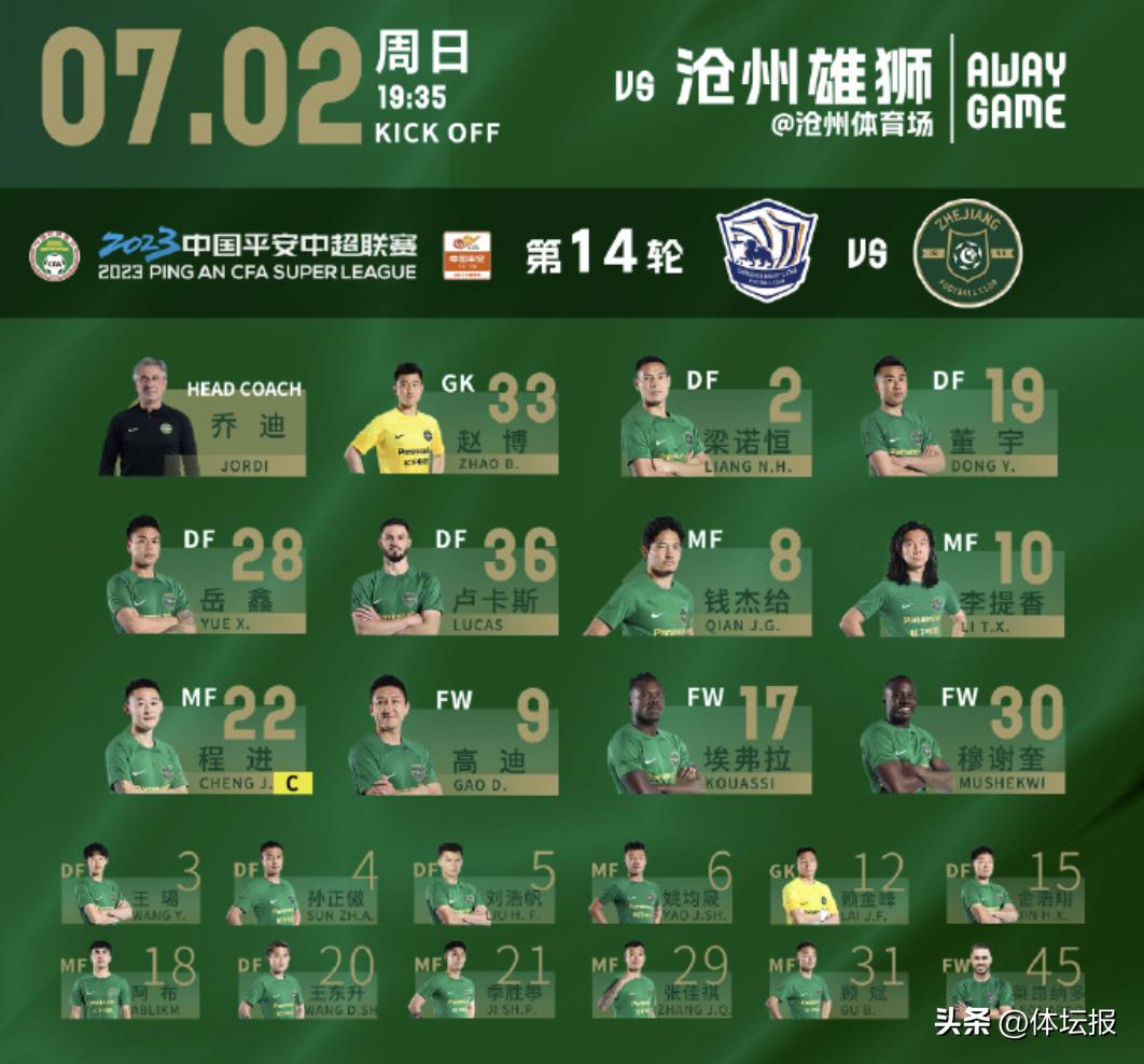 7月2日,中超第十四輪比賽開打,浙江隊客場挑戰滄州雄獅。本場比賽,浙江隊租借的外援,目前中超射手榜第一名的萊昂納多出現在大名單上,作爲替補出戰,爲主教練喬迪帶來更多戰術人員選擇。