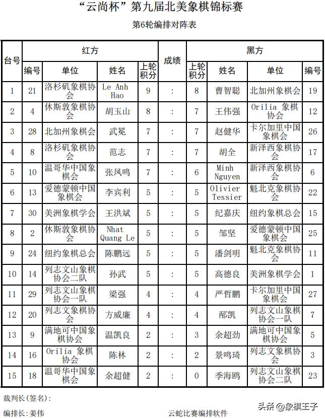 北加州象棋會曹智聰與休斯敦象棋協會胡玉山8分,Orilia 象棋協會王偉強、北加州象棋會武冕、卡爾加里中國象棋會趙健華、洛杉磯象棋協會範志、新澤西象棋協會胡全、溫哥華中國象棋會張鳳鳴7分,另有多人6分、5分等。