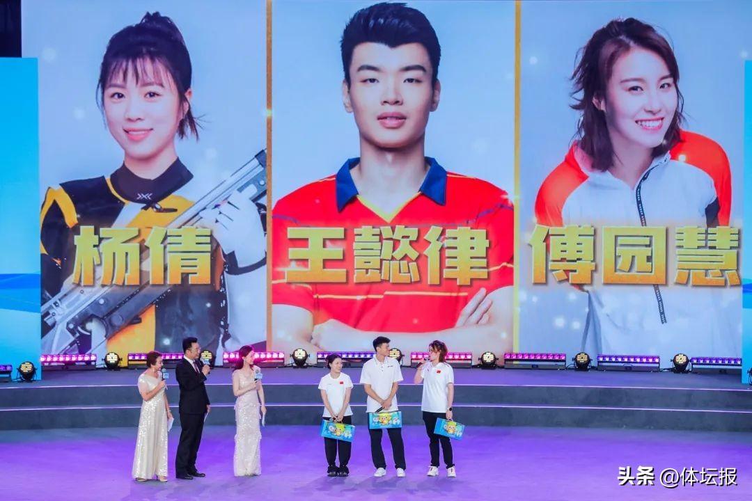 隨後浙江籍奧運冠軍楊倩、王懿律,世界冠軍傅園慧登臺,現場瞬間爆發出不絕的歡呼聲。三位冠軍爲港澳青年們帶來禮物,送出寄語,將運動拼搏精神傳播給在場青年朋友們。