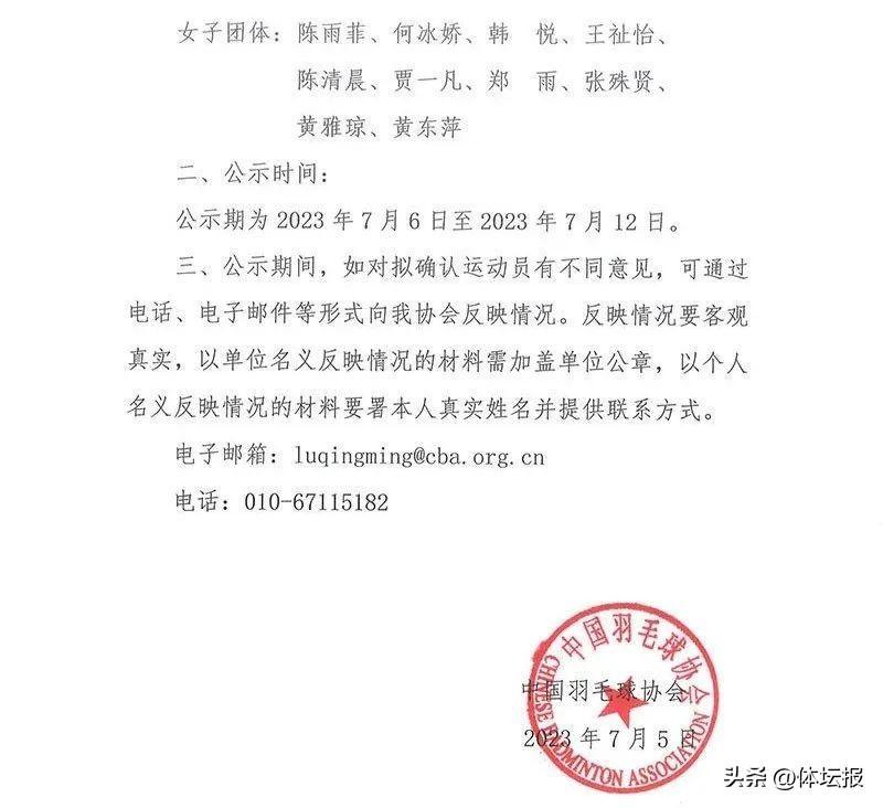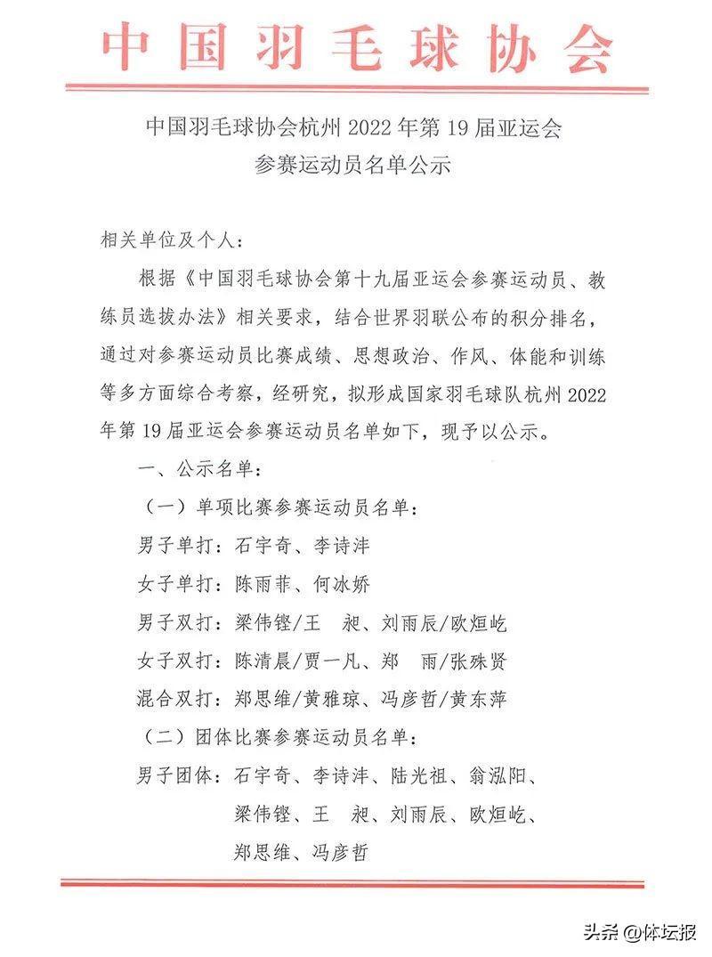 7月5日下午,中國羽毛球協會公佈了杭州亞運會參賽運動員名單,在這份包含20人的名單中,來自浙江的四位選手陳雨菲、鄭思維、黃雅瓊和王昶榜上有名,他們將分別代表國羽參加杭州亞運會羽毛球項目的女子單打、男子雙打和混合雙打三個單項及男子女子團體賽事。