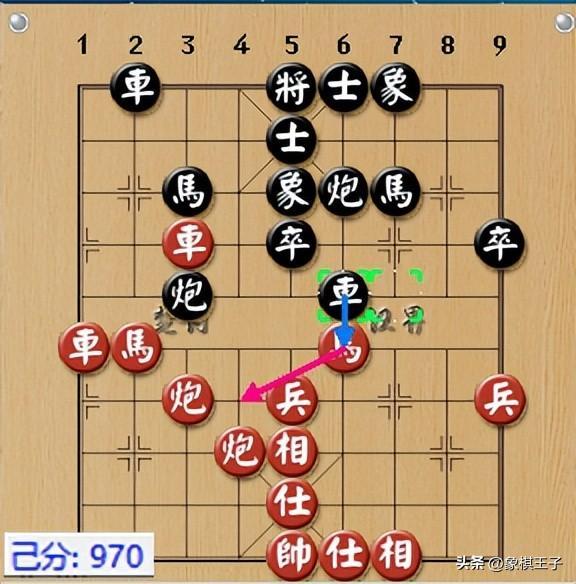 至中盤,紅集結雙車雙炮馬五子在左側,對黑棋右路形成了圍剿之勢,只需一手馬四退六,右馬再騰挪左翼,六子歸邊,火力發射,就大優了超900分,黑勢岌岌可危。