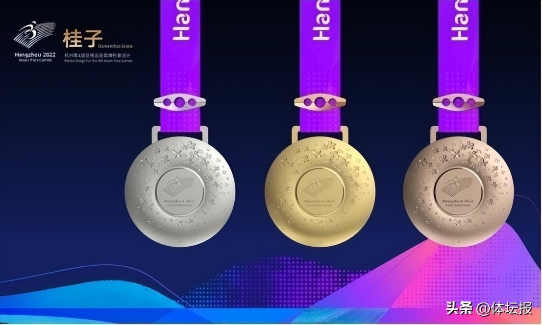 獎牌取名爲“桂子”,是源自描寫杭州的名句“山寺月中尋桂子”,寓含江南意境和浪漫色彩。系繼會徽“向前”,吉祥物“飛飛”,色彩系統“潤澤”,火炬“桂冠”後又一杭州亞殘運會視覺形象體系的核心元素,是亞殘運文化美學的重要表達。