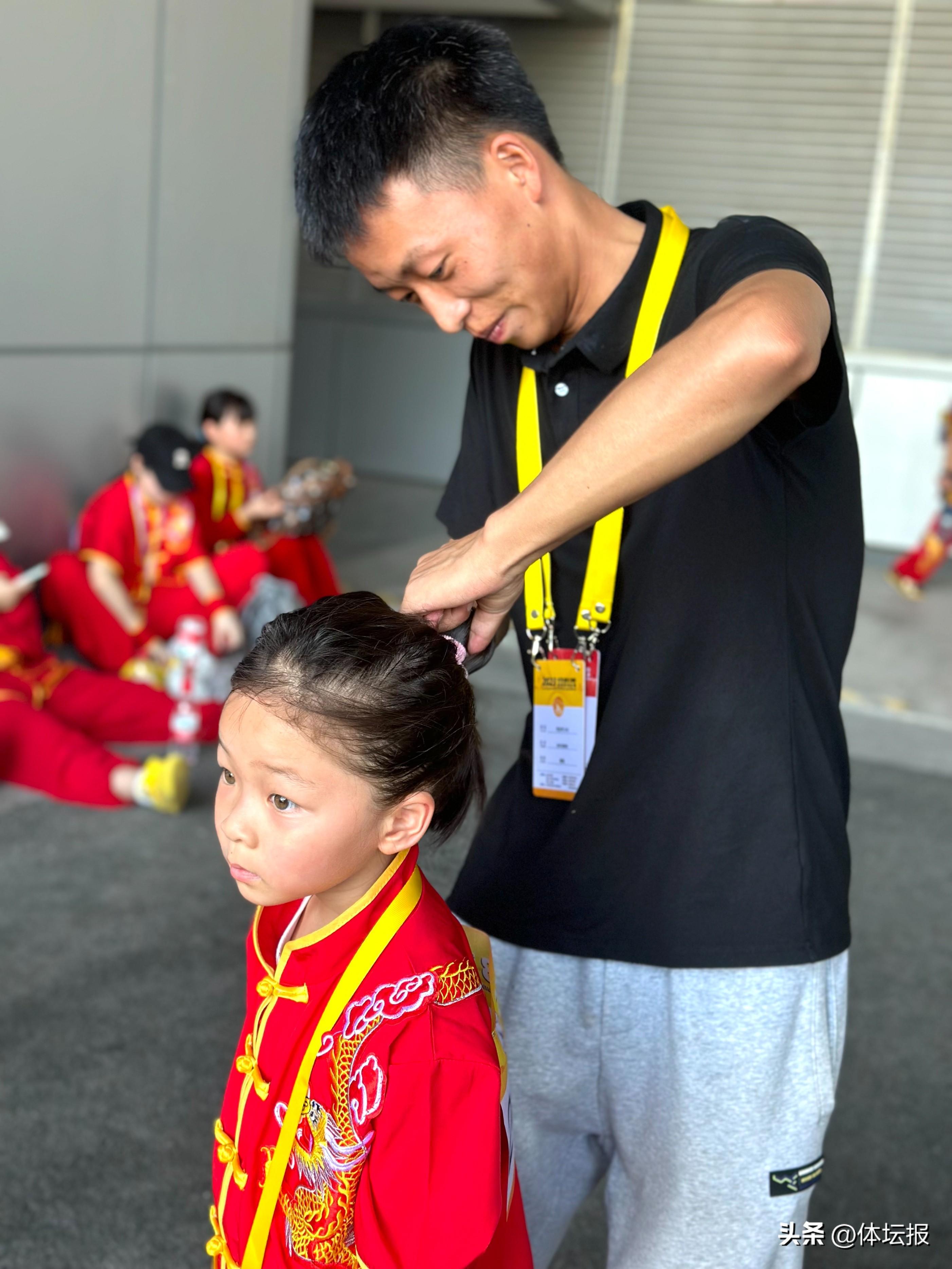 賽前,來自江南武館的劉志偉教練甚是忙碌,一邊給5歲的熊子魚扎頭髮,一邊和其他孩子講解比賽時的注意事項。成了臨時“爸爸”的他和另兩位教練此次比賽一共帶了30個孩子前來參賽,劉志偉坦言,孩子們都非常熱愛武術,最少的也學習了近一年,家長們也放心讓他們代管。雖累,但看到孩子們在賽場上的生龍活虎,作爲教練特別自豪。