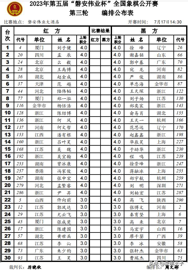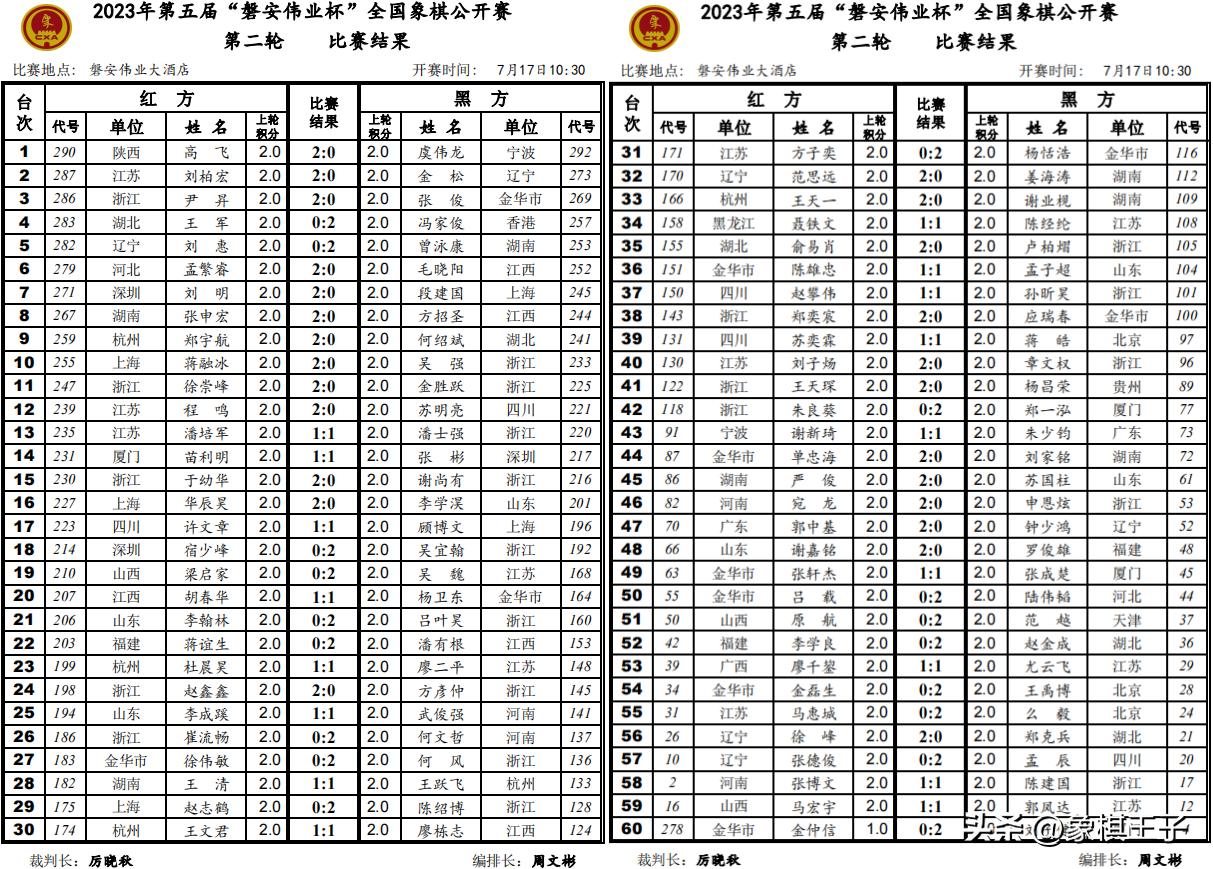 7月17日上午,2023年第五屆磐安偉業杯全國象棋公開賽前兩輪比賽在浙江磐安戰罷,王天一、趙鑫鑫、孟辰、孟繁睿、劉柏宏等43人取得二連勝,程宇東等多人1勝1平。象棋王子全程直播。