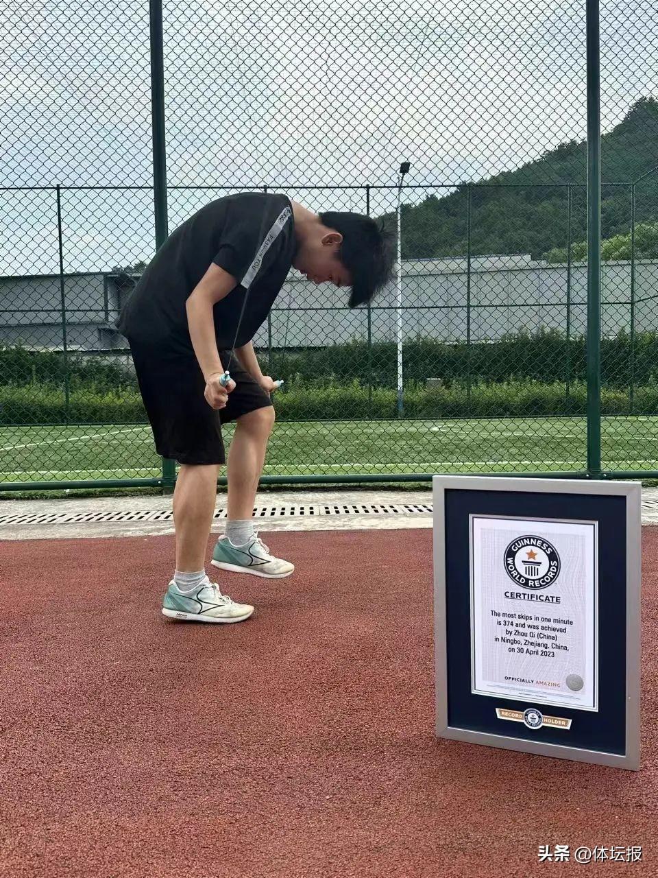 視頻中,周琦的雙腳像裝了馬達,手上的繩子速度快到看不清,最終取得60秒單搖374次的成績,打破日本選手保持10年的吉尼斯世界紀錄,超出前紀錄26次。