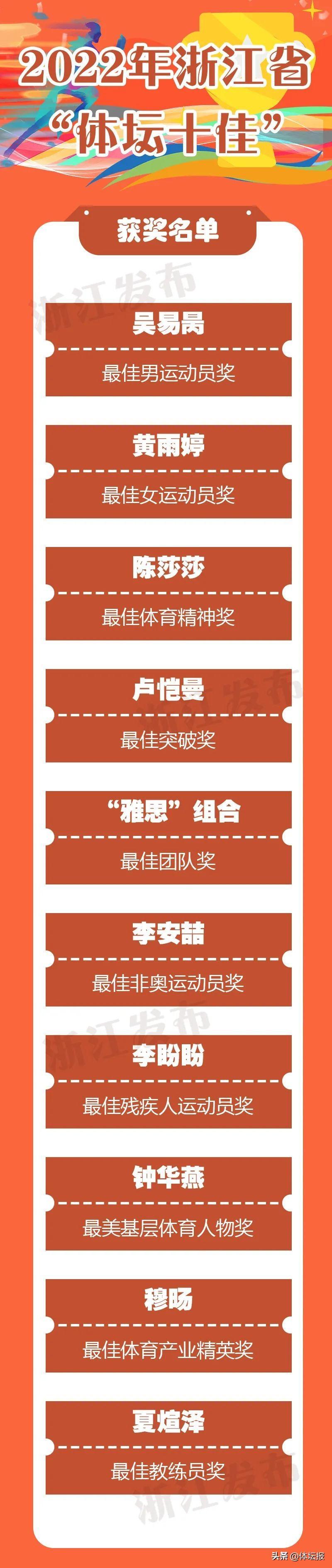 7月18日,由浙江省體育局、浙江廣播電視集團指導,浙江省體育記者協會主辦,浙江廣播電視集團錢江都市頻道、體壇報社承辦的中國銀行·2022浙江省“體壇十佳”頒獎盛典在浙江國際影視中心舉行,最佳男(女)運動員獎、體育精神獎、突破獎、團隊獎、非奧運動員獎、殘疾人運動員獎、教練員獎,以及最美基層體育人物獎、最佳體育產業精英獎一一揭曉。