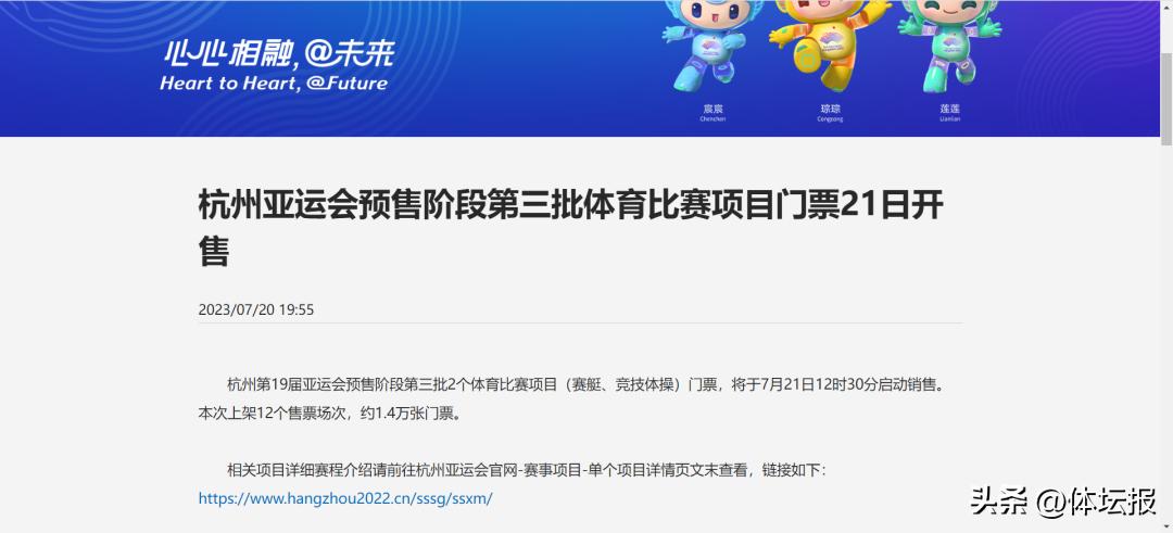 杭州亞運會票務官網更新最新消息:杭州第19屆亞運會預售階段第三批2個體育比賽項目(賽艇、競技體操)門票,於7月21日12時30分啓動銷售。本次上架12個售票場次,約1.4萬張門票。