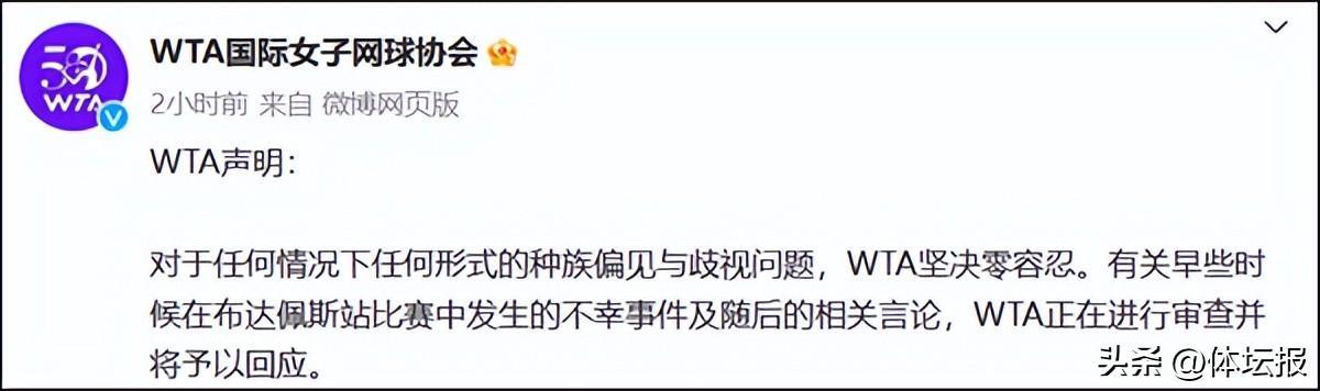 此前,WTA國際女子網球協會就張帥事件發佈聲明:“對於任何情況下任何形式的種族偏見與歧視問題,WTA堅決零容忍。”並表示WTA正在進行審查並將予以回應。