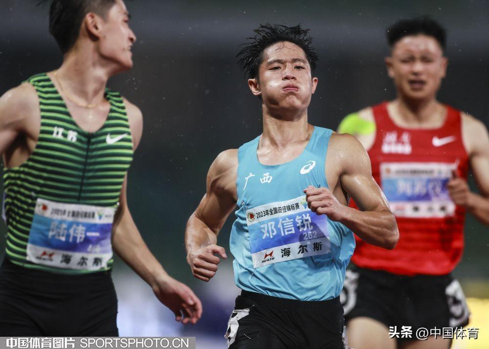 男子100米“飛人大戰”,年僅19歲的廣西隊鄧信銳以10秒23奪冠,江蘇鐵人隊陸偉一和福建隊林啓幫分獲銀牌和銅牌,成績分別爲10秒24和10秒30。