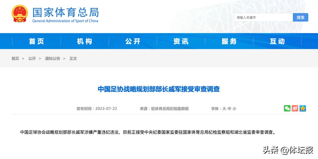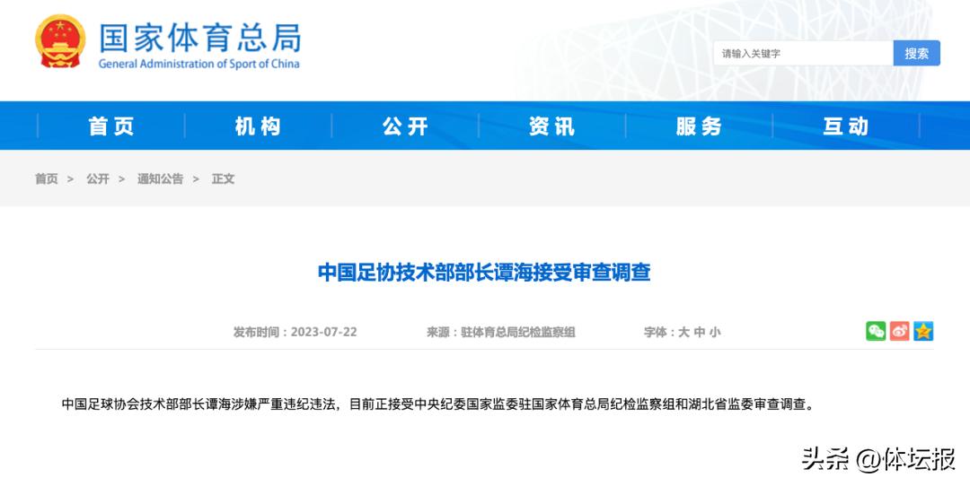 中國足協戰略規劃部部長戚軍接受審查調查中國足球協會戰略規劃部部長戚軍涉嫌嚴重違紀違法,目前正接受中央紀委國家監委駐國家體育總局紀檢監察組和湖北省監委審查調查。中國足協技術部部長譚海接受審查調查中國足球協會技術部部長譚海涉嫌嚴重違紀違法,目前正接受中央紀委國家監委駐國家體育總局紀檢監察組和湖北省監委審查調查。來源:國家體育總局網站、人民日報