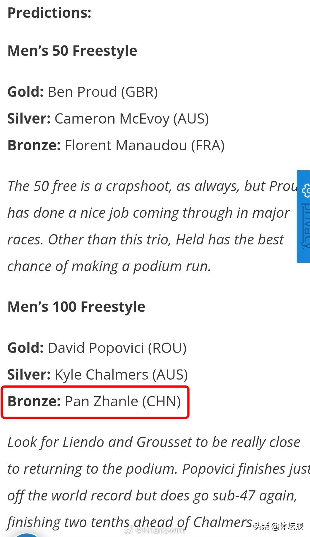 世界游泳雜誌預測他在100米自由泳項目能拿到第三名,這對於19歲的他來說已經是非常高的評價了。要想加冕百米新“飛魚”,潘展樂需要有一顆大心臟。