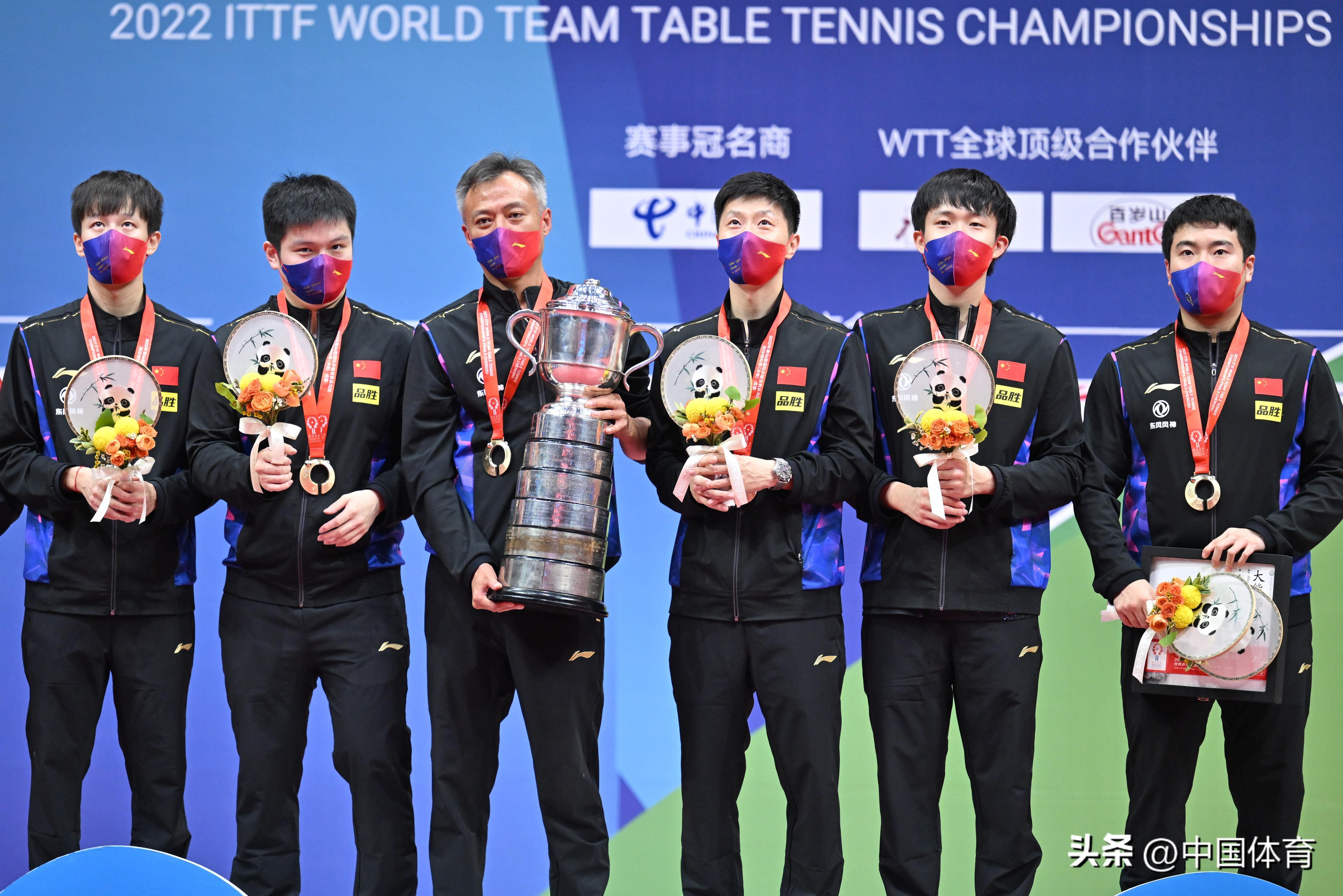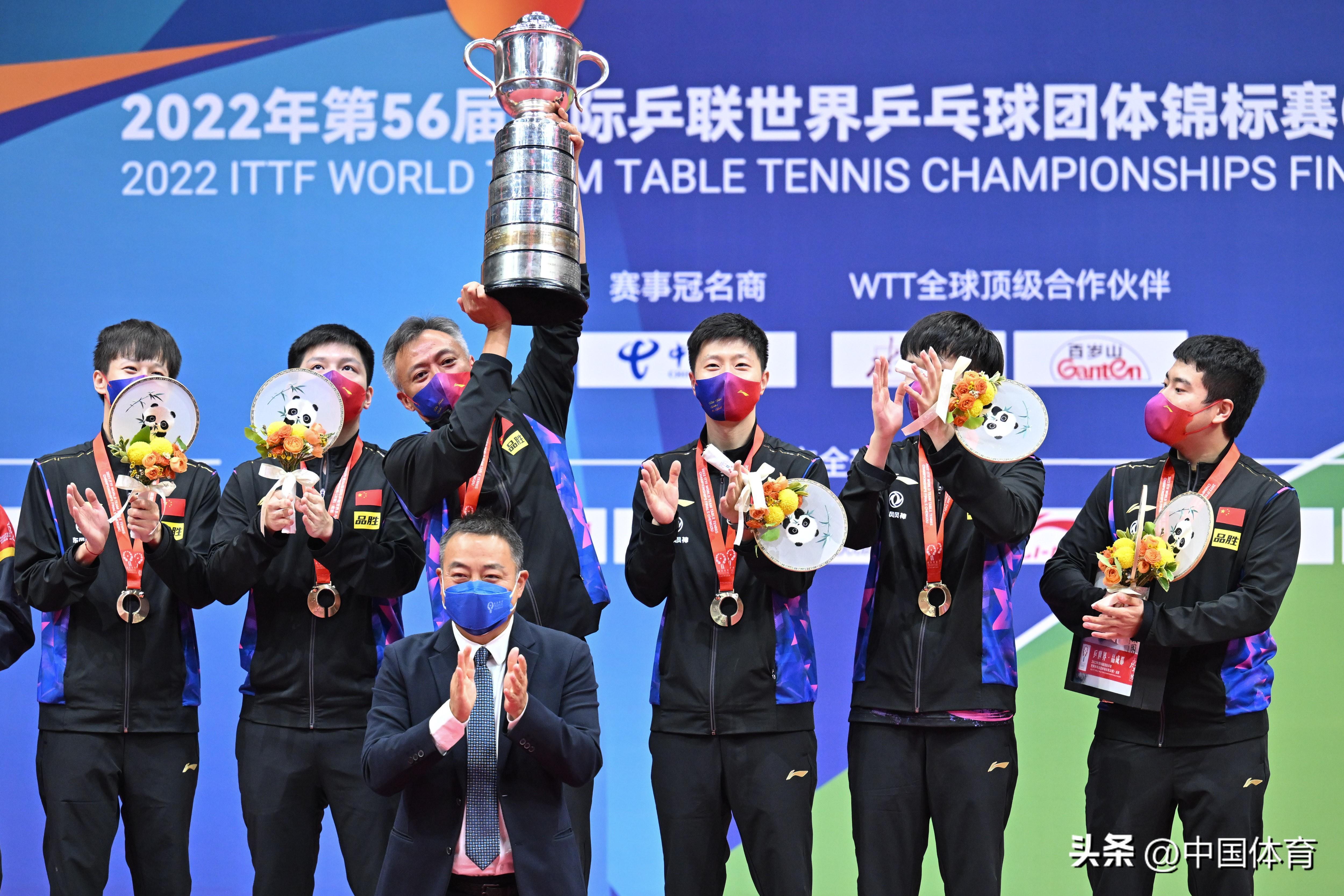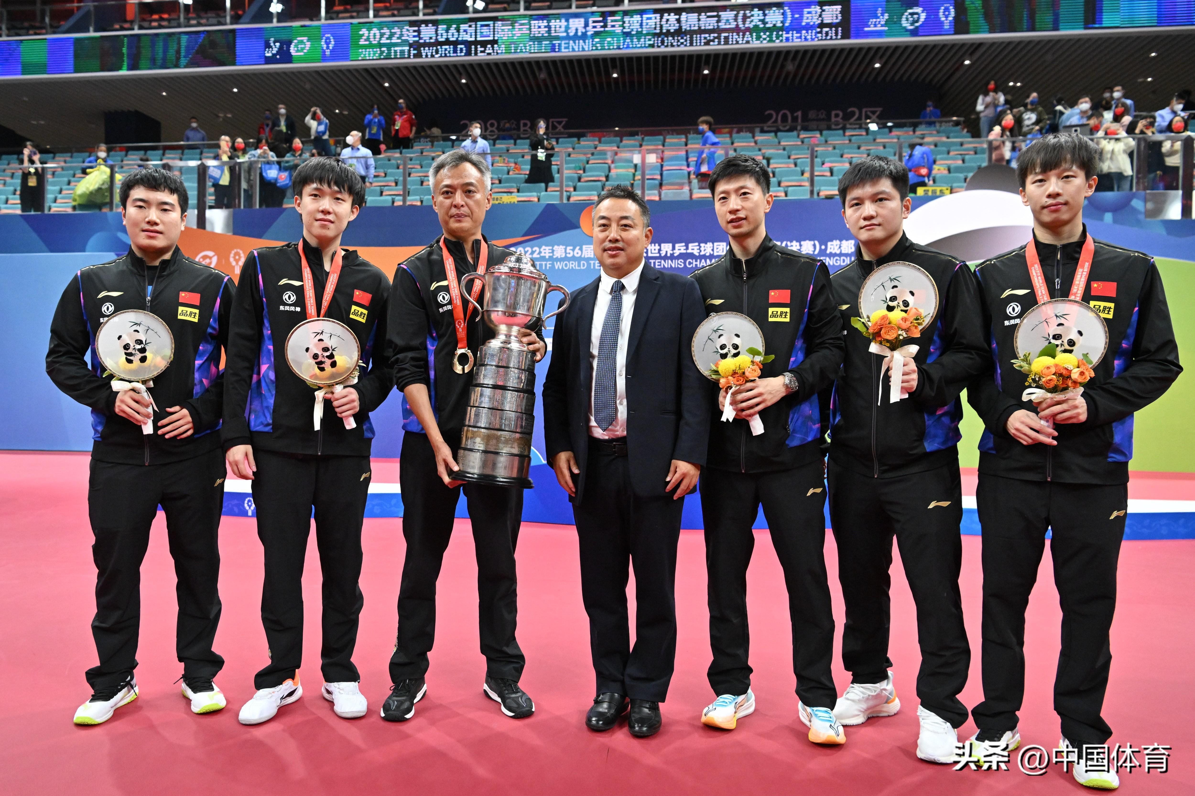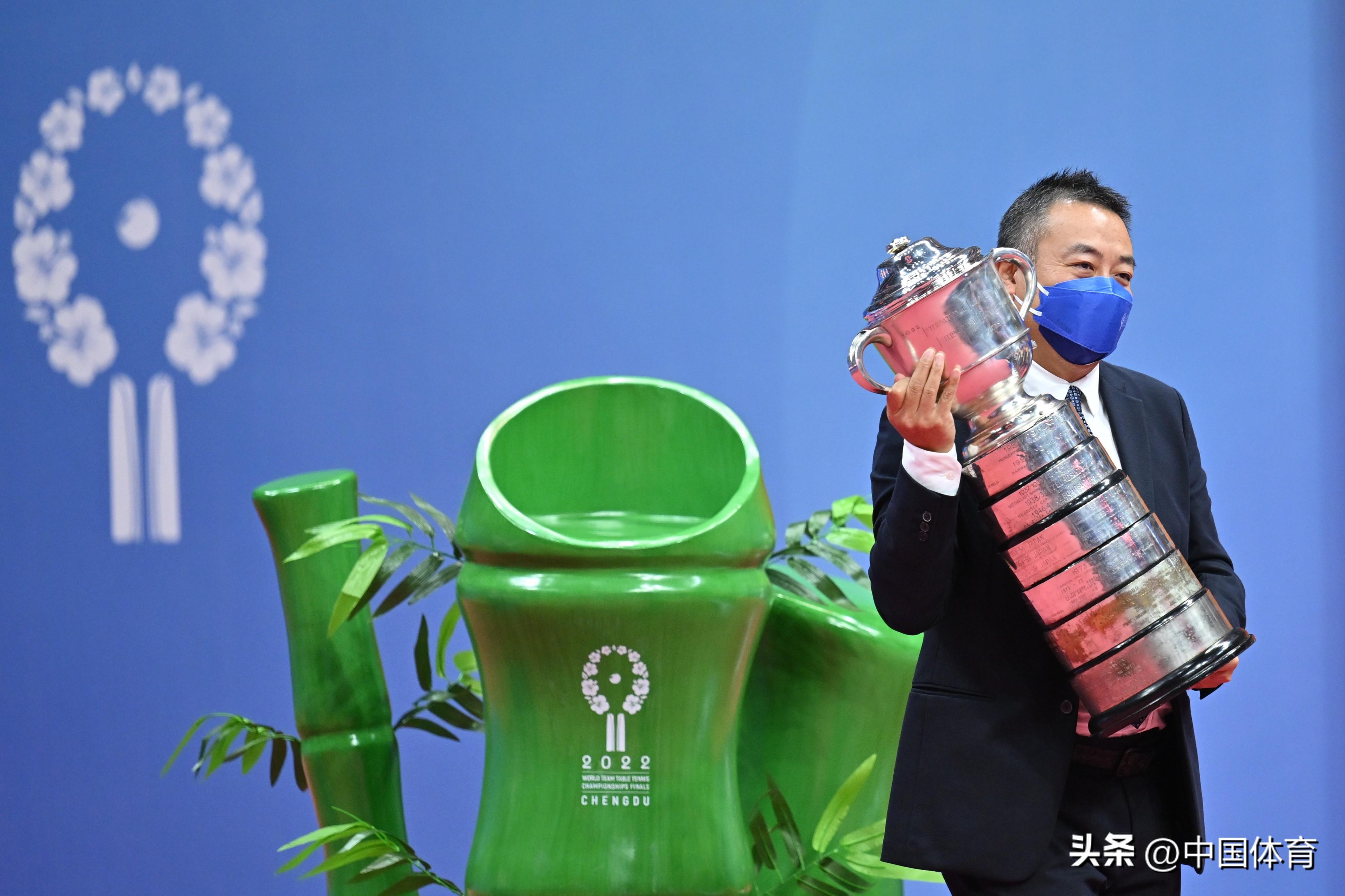 中國體育訊 10月9日晚,在成都世乒賽男團決賽中,中國隊以3比0橫掃老對手德國隊,贏得十連冠。這也是中國男乒歷史上第22次贏得世錦賽團體賽桂冠。頒獎儀式上,秦志戩教練與隊員們一起捧起了象徵男團最高榮譽的斯韋思林杯。圖爲頒獎儀式現場畫面。(中國體育圖片 白宇 攝)