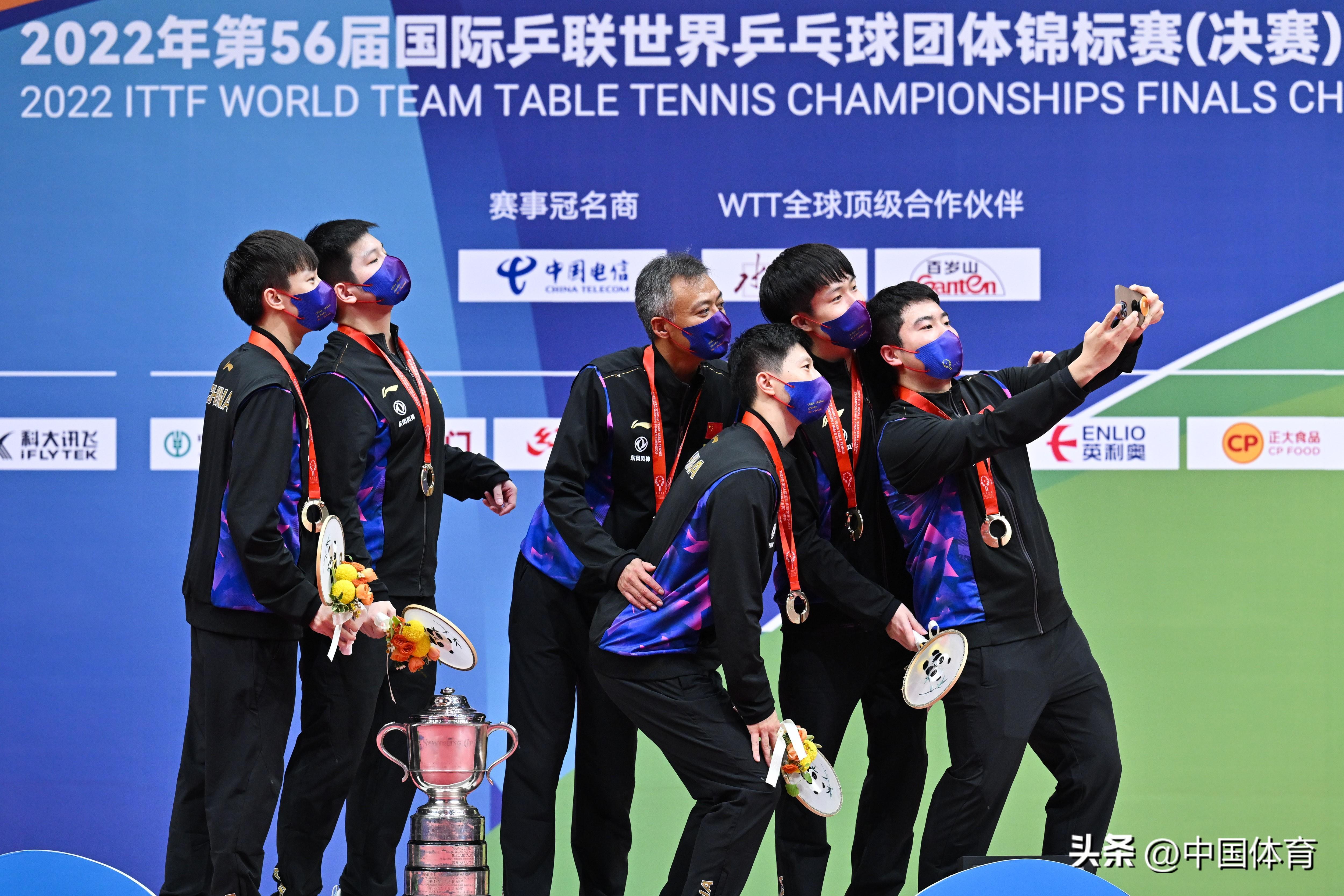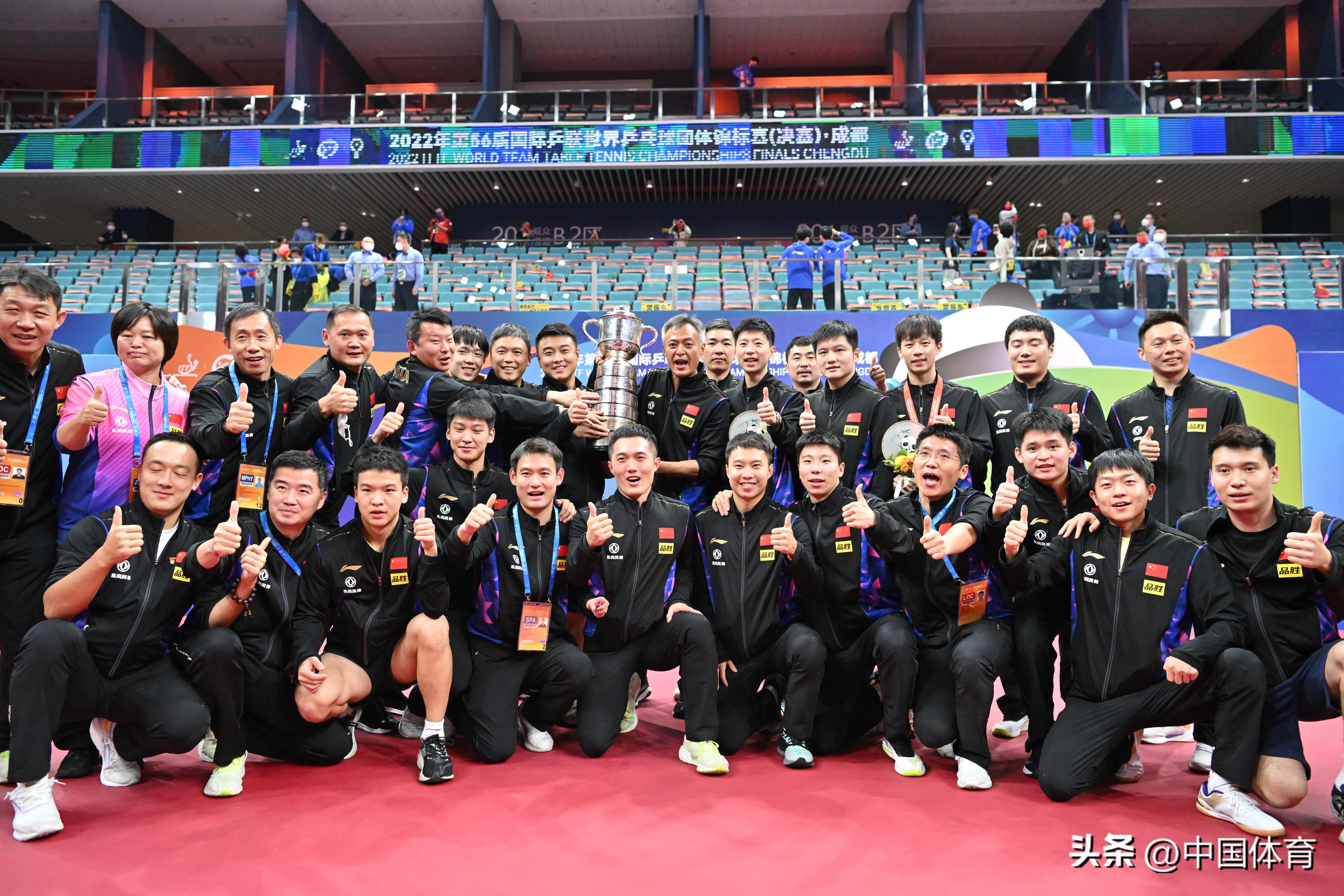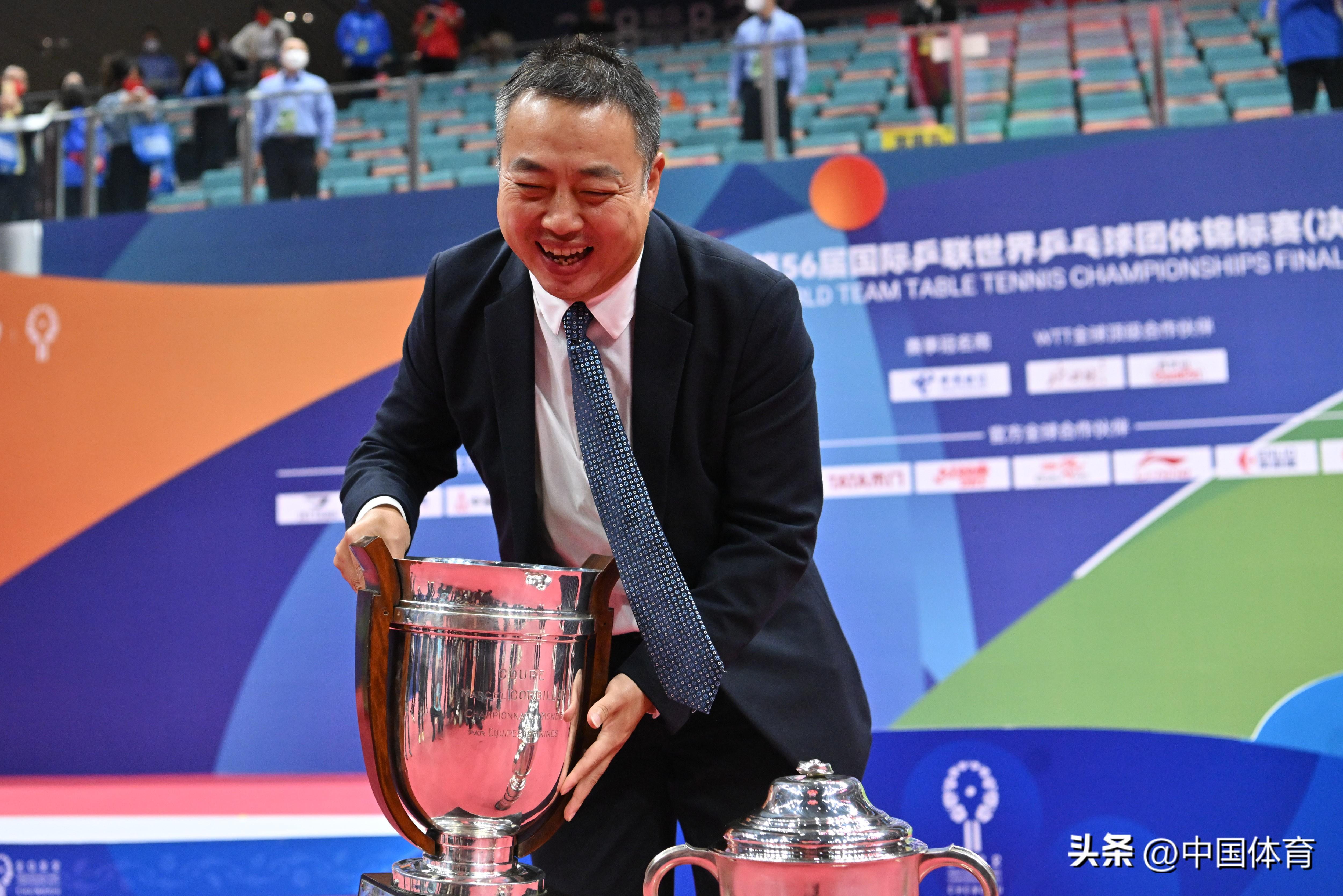 中國體育訊 10月9日晚,在成都世乒賽男團決賽中,中國隊以3比0橫掃老對手德國隊,贏得十連冠。這也是中國男乒歷史上第22次贏得世錦賽團體賽桂冠。頒獎儀式上,秦志戩教練與隊員們一起捧起了象徵男團最高榮譽的斯韋思林杯。圖爲頒獎儀式現場畫面。(中國體育圖片 白宇 攝)