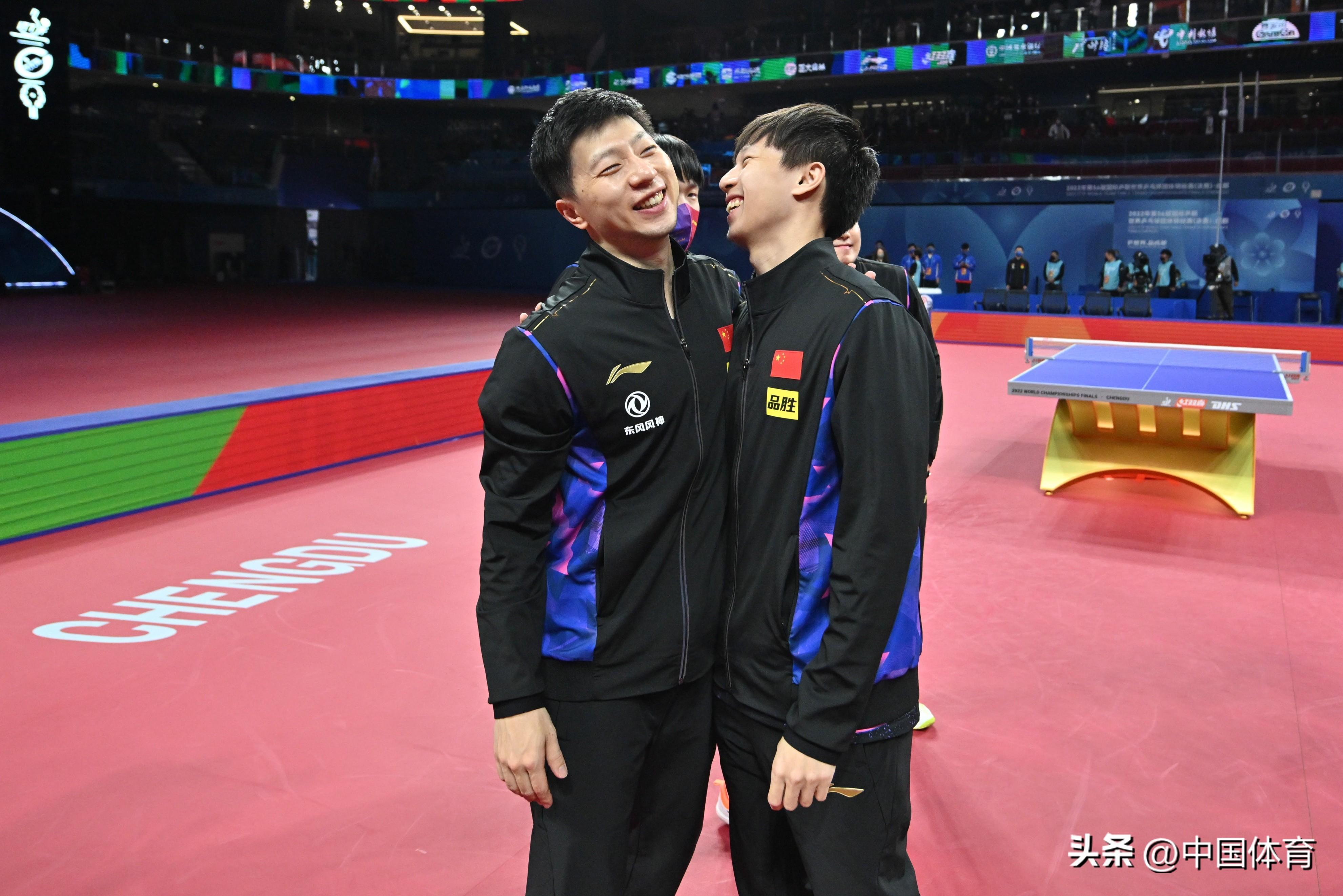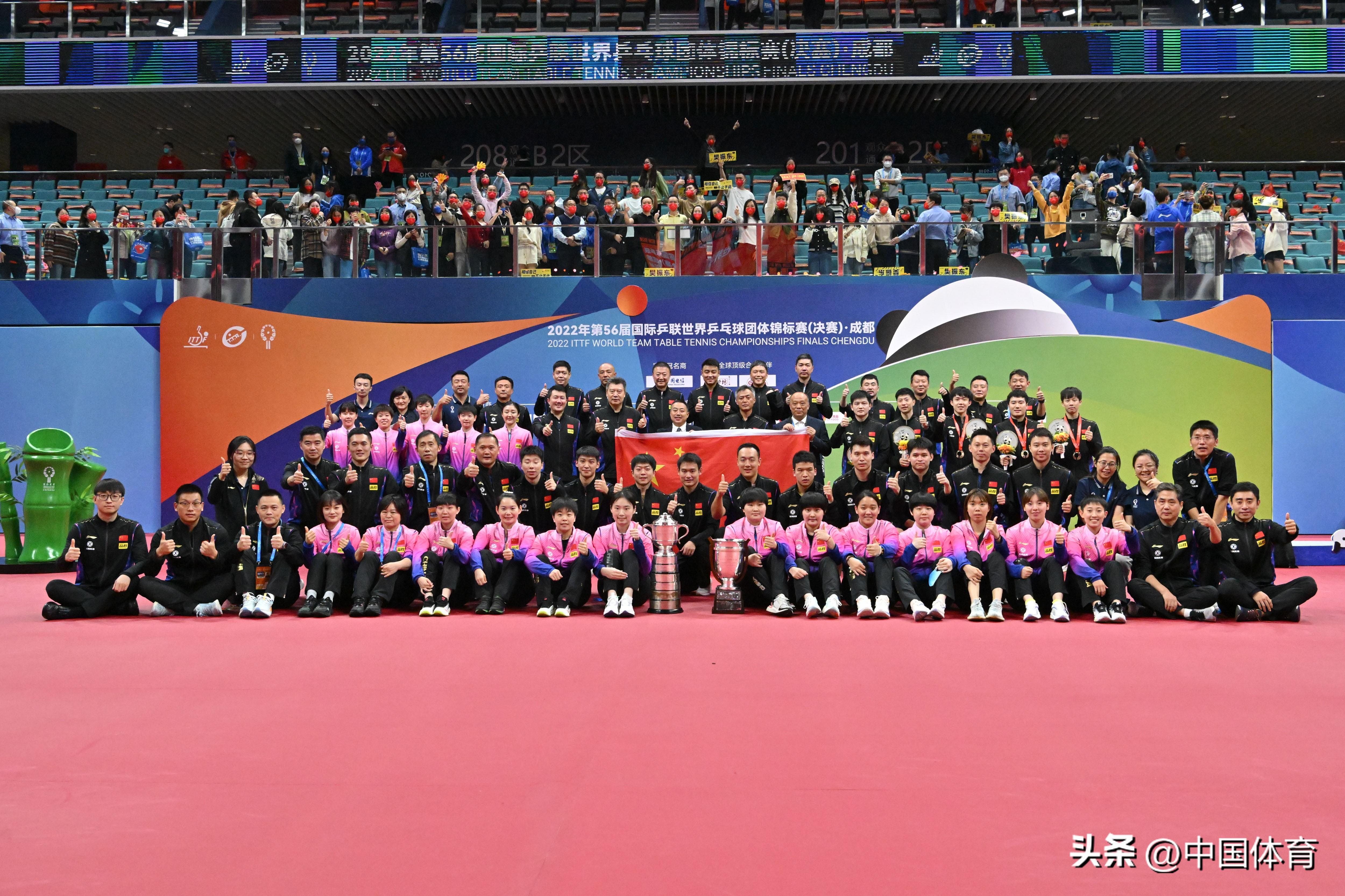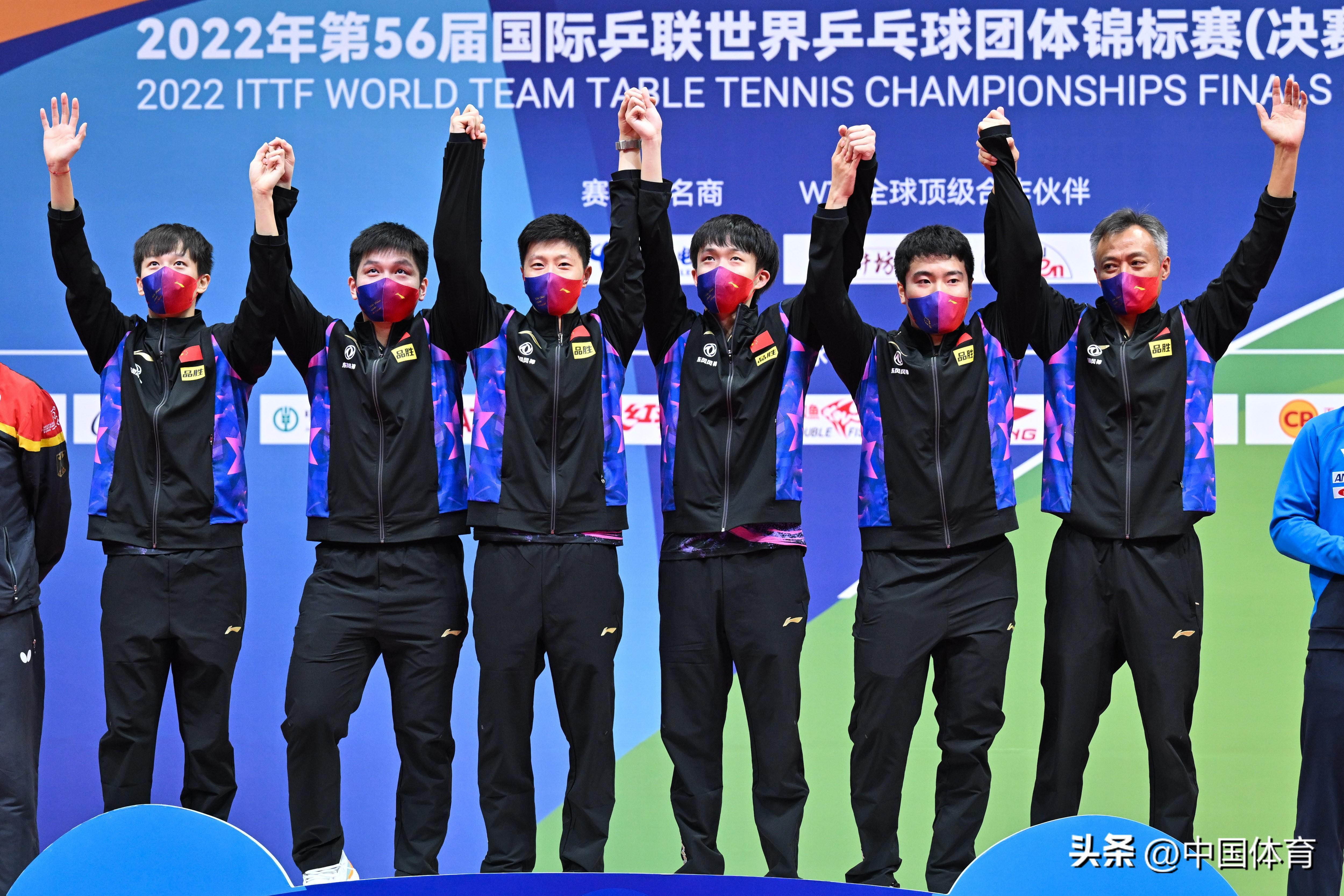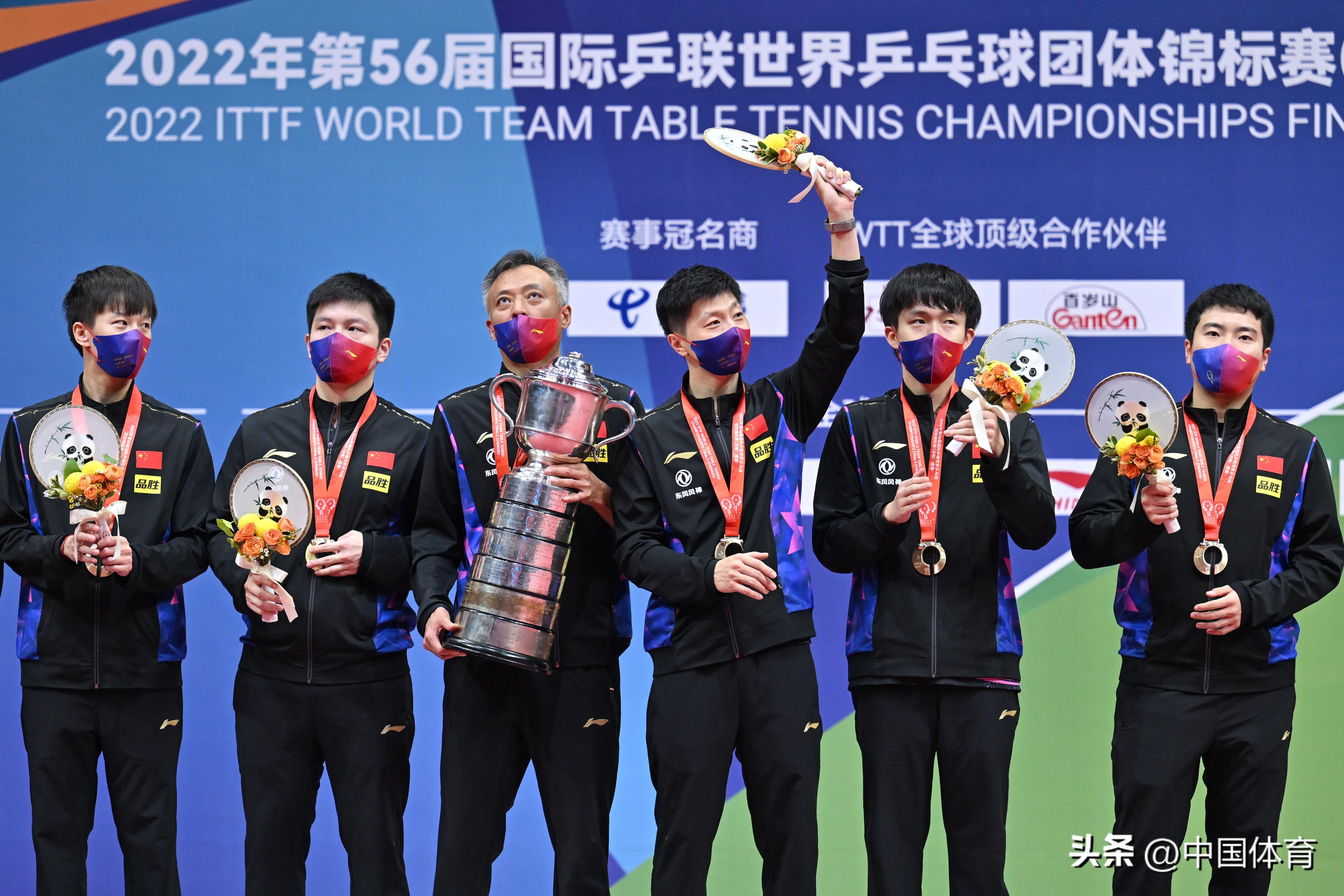 中國體育訊 10月9日晚,在成都世乒賽男團決賽中,中國隊以3比0橫掃老對手德國隊,贏得十連冠。這也是中國男乒歷史上第22次贏得世錦賽團體賽桂冠。頒獎儀式上,秦志戩教練與隊員們一起捧起了象徵男團最高榮譽的斯韋思林杯。圖爲頒獎儀式現場畫面。(中國體育圖片 白宇 攝)