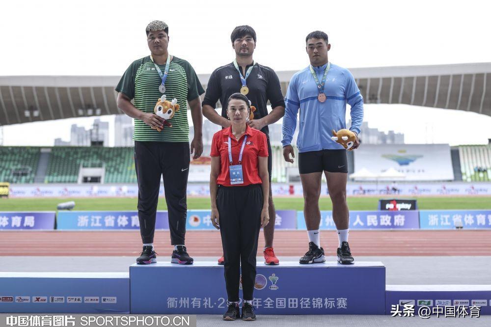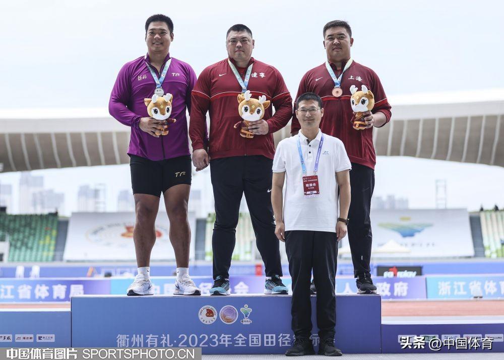 男子鉛球冠軍劉洋(中)、亞軍田子重(左)和季軍陳小冬在頒獎儀式上
