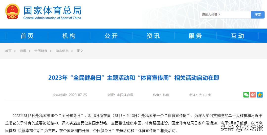 2023年8月8日是我國第15個“全民健身日”,8月8日所在周(8月7日至13日)是我國第一個“體育宣傳週”。爲深入學習貫徹黨的二十大精神和習近平總書記關於體育的重要論述精神,深入實施全民健身國家戰略,全面推進健康中國、體育強國建設,定於8月8日前後在全國範圍內開展“全民健身日”主題活動和“體育宣傳週”相關活動。現將有關事項通知如下。