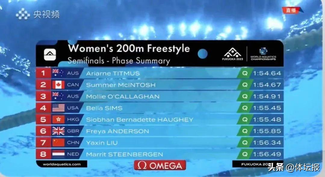 女子200米自由泳上,在女子4*100米自由泳接力中表現神勇的浙江選手柳雅欣先以1分56秒93晉級半決賽,在良好節奏控制下以1分56秒34半決賽第七名晉級決賽。