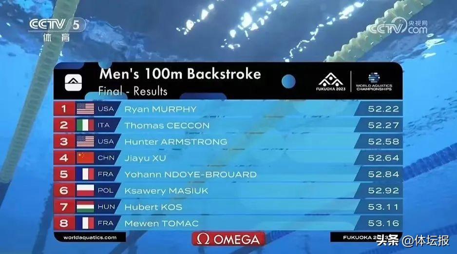 今晚最令人期待的比賽莫過於男子100米仰泳決賽。兩屆世錦賽冠軍徐嘉餘以52秒64拿到第4名,雖無緣領獎臺,但他也用成績宣告自己正在迴歸世界頂尖水準。