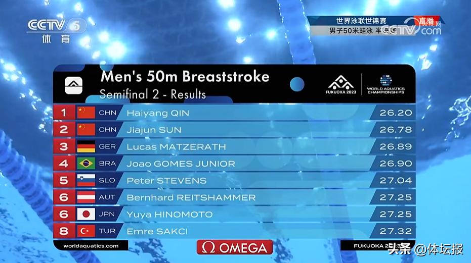 同項目的孫佳俊也以26秒76半決賽第三晉級決賽,兩名中國蛙泳選手的決賽表現值得期待。