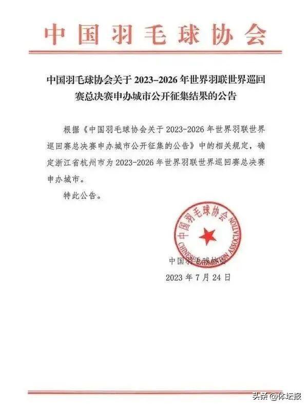 北京時間7月24日,中國羽協官方發佈公告,確定杭州市爲2023-2026年世界羽聯巡迴賽總決賽申辦城市。以下爲公告原文:根據《中國羽毛球協會關於2023-2026年世界羽聯世界巡迴賽總決賽申辦城市公開徵集的公告》中的相關規定,確定浙江省杭州市爲2023-2026年世界羽聯世界巡迴賽總決賽申辦城市。特此公告。網友實名羨慕:又是杭州啊!期待!來源:中國羽協 光明網