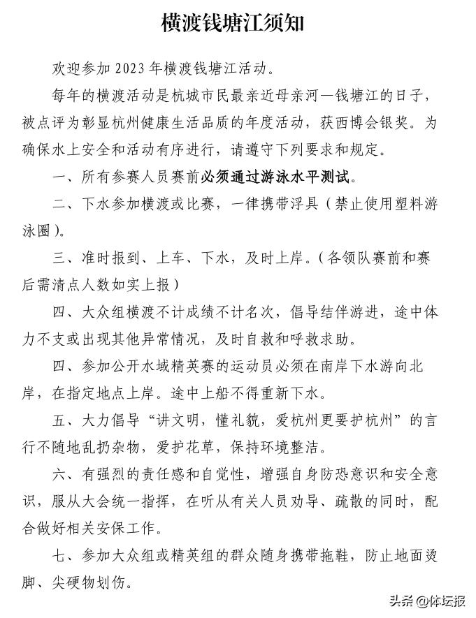 “橫渡錢塘江不是競賽,而是一場大衆參與的活動,希望大家快快樂樂、平平安安的。”杭州市水上救生協會副祕書長金彥說道。活動當天,協會工作人員、救生員們會全程護航,以保證大家的安全。“如有不舒服的市民,或者留意到身邊人有異常情況的都可以示意,工作人員會第一時間提供幫助。”