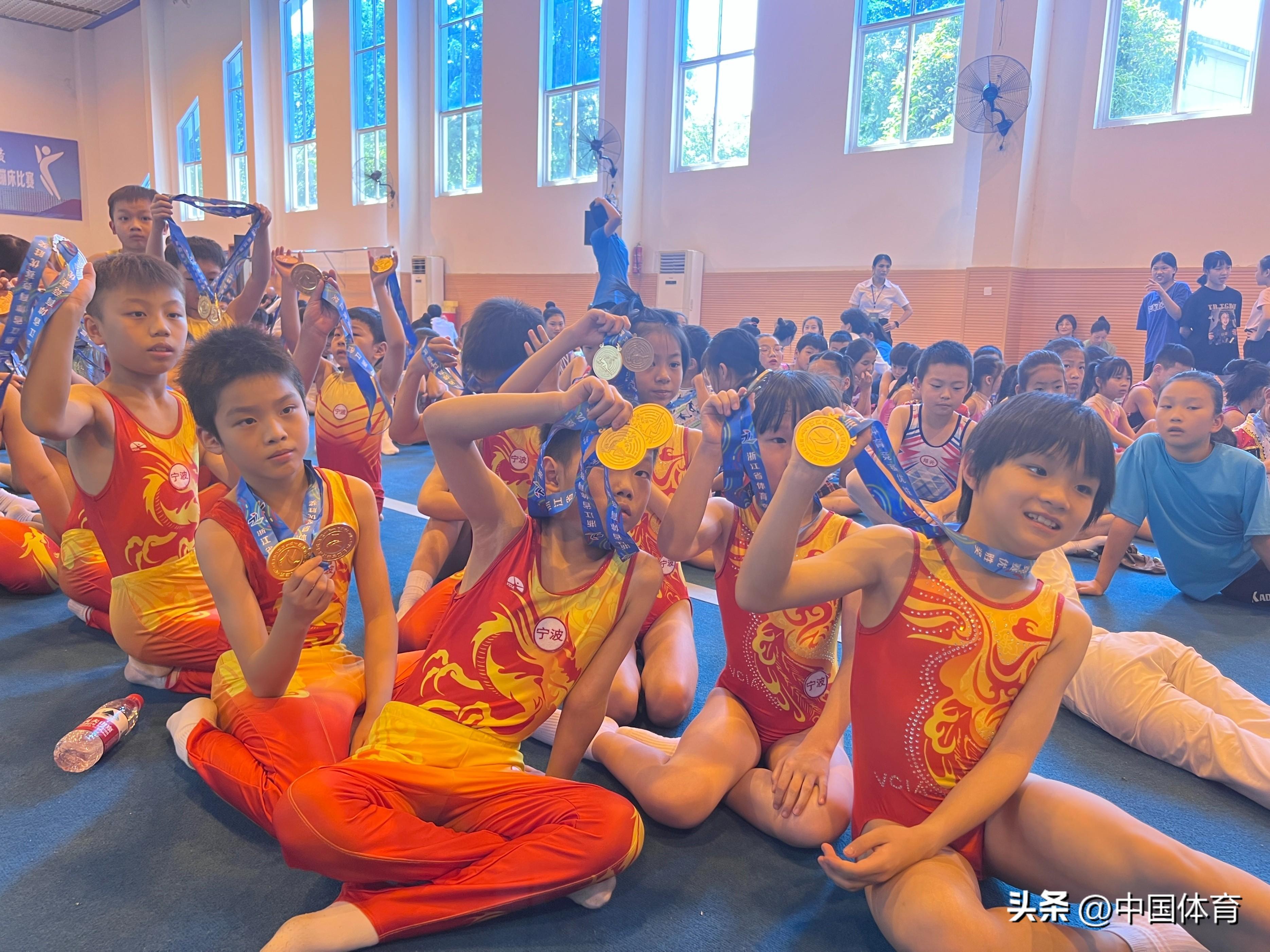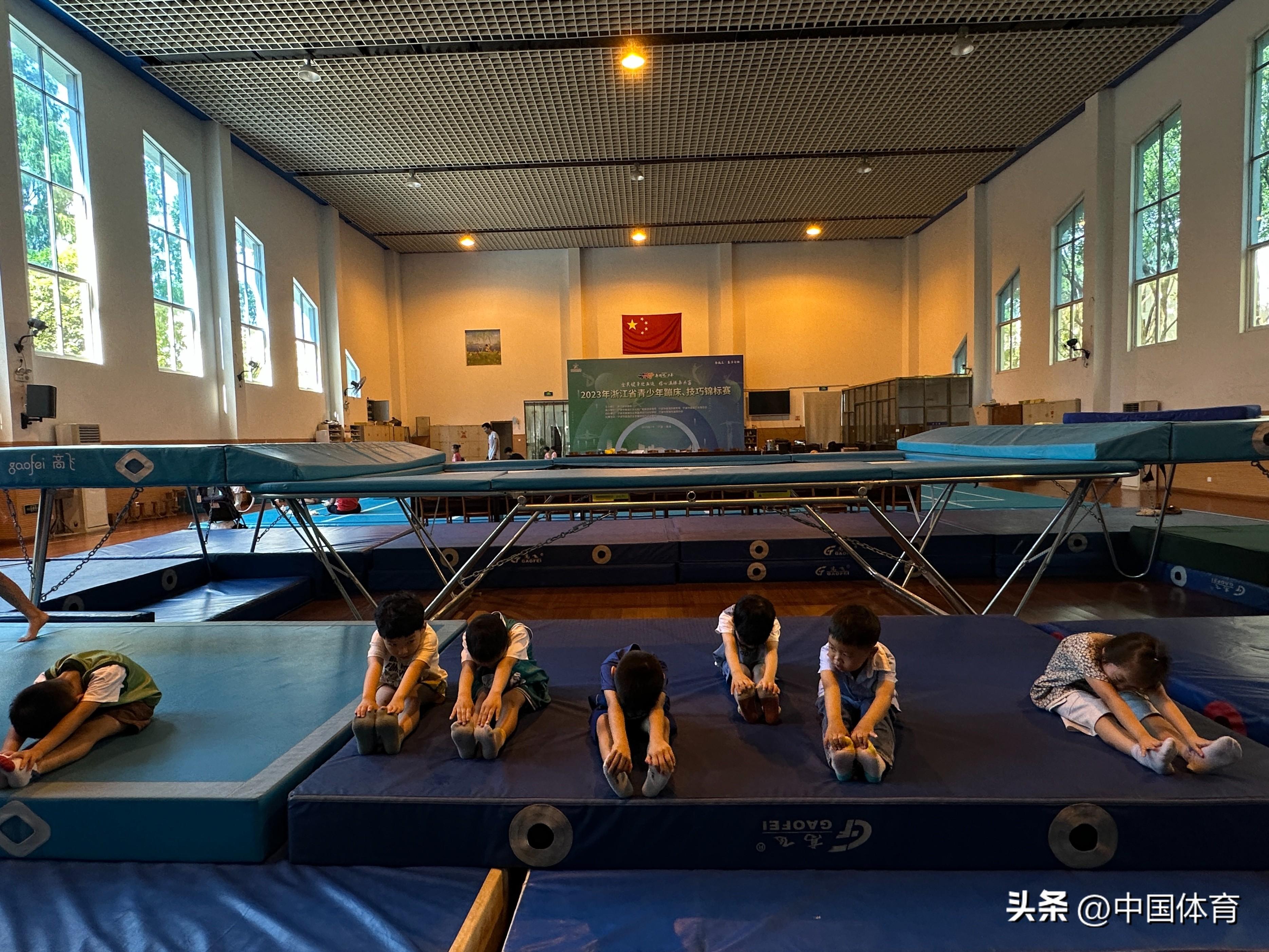 鎮海區蹦技小將在2023年浙江省青少年蹦牀、技巧錦標賽中獲獎現場