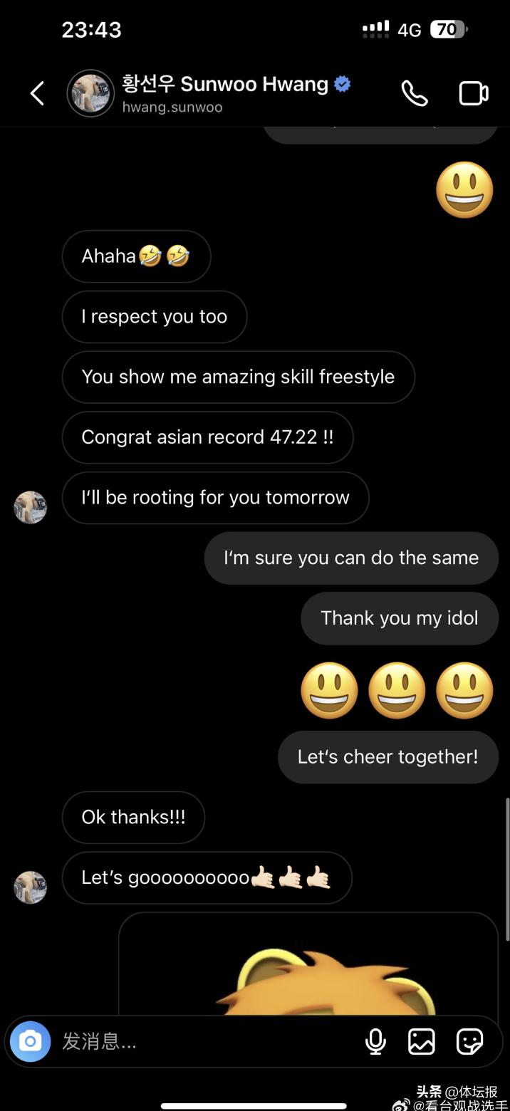 賽場外,潘展樂和韓國選手黃宣優(Hwang Sun-woo)在社交平臺上互動交流。