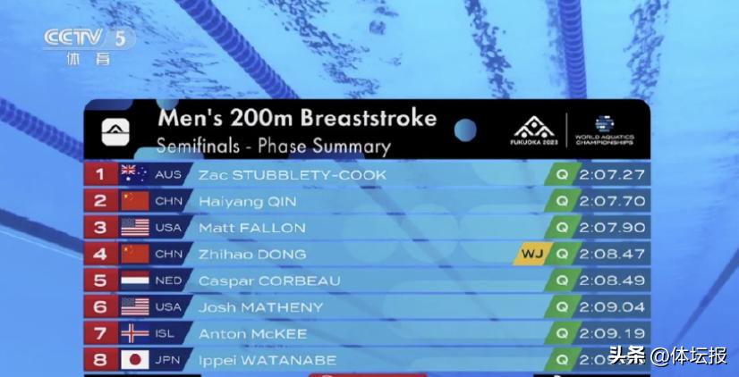 覃海洋延續前幾日狀態,以2分07秒70半決賽第二晉級男子200米蛙泳決賽,董志豪也跟上步伐,並以2分08秒47刷新世界青年紀錄晉級。