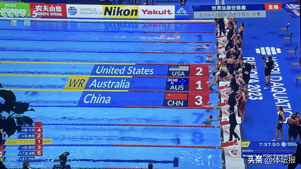 決賽中,中國隊從第6道出發,李冰潔開棒穩住第二的位置,第二棒李家萍略有落後,隨後艾衍含再次追到第三名,第四棒柳雅欣頂住了壓力拉開與英國隊的距離率先觸壁,中國隊以7分44秒40的成績再獲一枚接力銅牌!澳大利亞隊7分37秒50創造新的世界紀錄奪冠。
