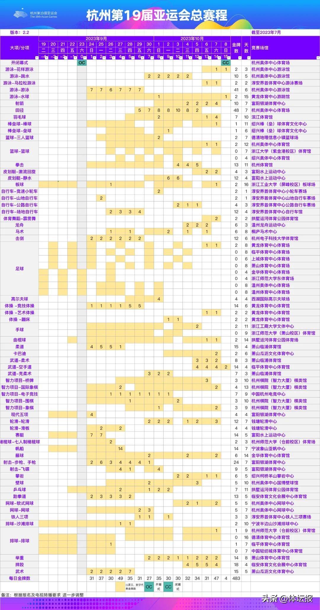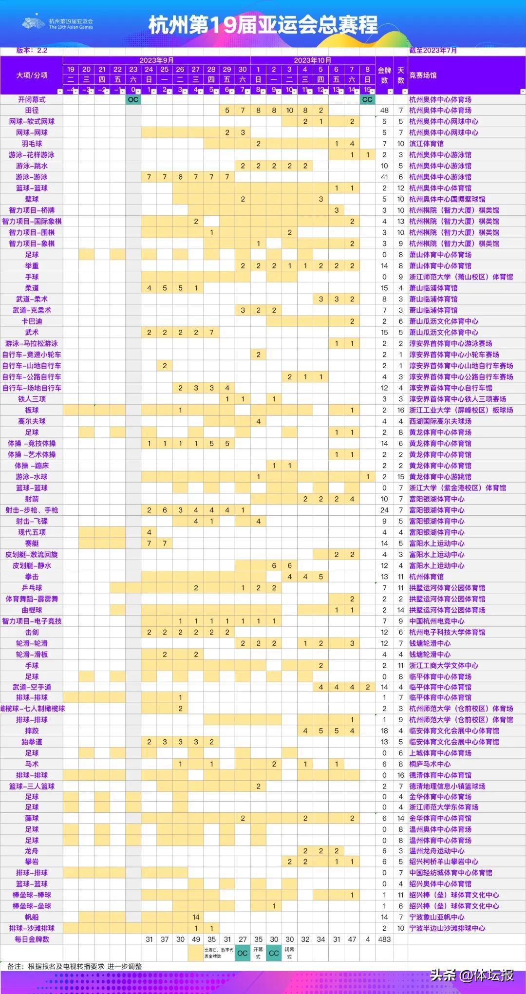 發佈了杭州亞運會總賽程2.2版