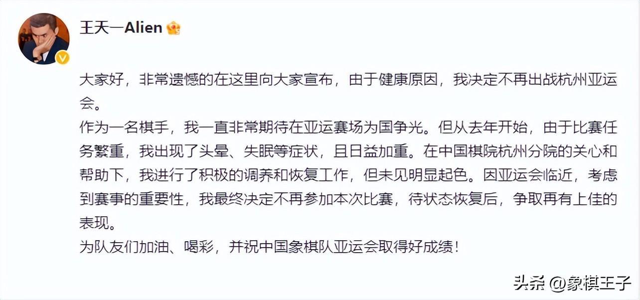 王天一的棋大家愛看,王天一的健康,同樣值得關心,外星人在聲明中稱,比賽任務繁重,頭暈、失眠等,日益加重。