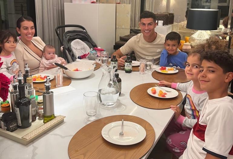 五個孩子圍坐在餐桌前,未婚妻喬治娜把最小的女兒抱在懷裏,因爲她現在還在哺乳期,穿着寬鬆,隨時可以方便餵奶,C羅則摟着龍鳳胎兒子馬特奧(Mateo),一家人其樂融融。