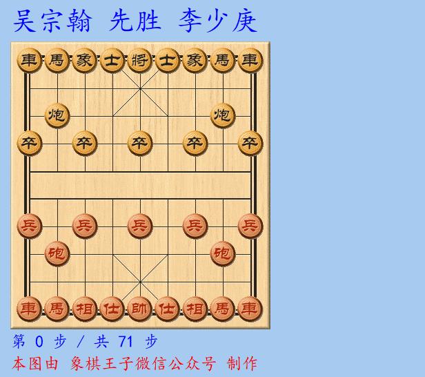 此役執先對上中國隊棋壇儒將李少庚,吳宗翰一上來就中炮直橫車進三兵局,下得非常兇,中兵連進,棄車殺炮,全力攻殺。