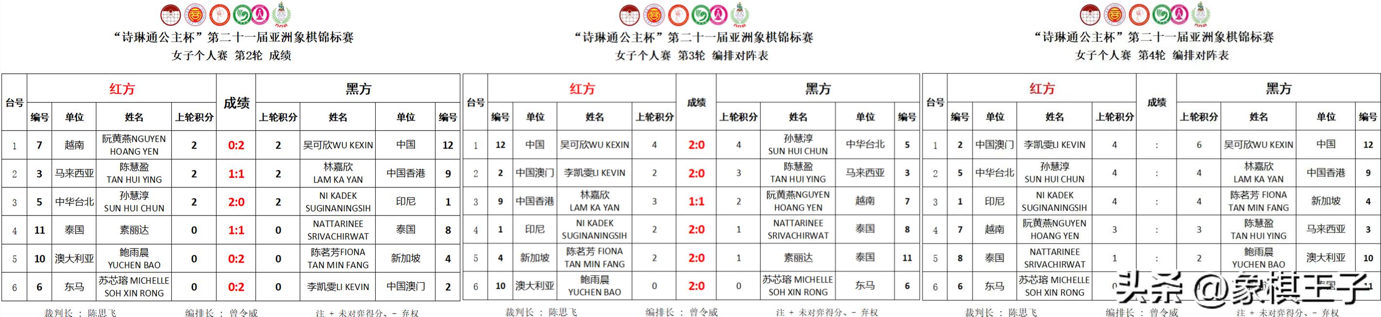 吳可欣三戰全勝,6分單騎領先,離冠軍及特大一步之遙,孫慧淳與印尼NI KADEK SUGINANINGSIH、新加坡陳茗芳、中國香港林嘉欣、中國澳門李凱雯,五人4分,阮黃燕、馬來西亞陳慧盈3分。