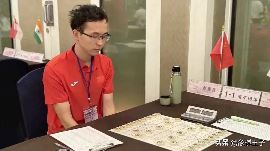 趙鑫鑫執紅與新加坡強手周勁程苦鬥上百手,兩邊仙人指路對卒底炮,紅跳右馬、黑衝3卒局,兌換雙車後,形成雙馬炮兵仕相全對雙炮馬雙卒士象全的殘局盤面。