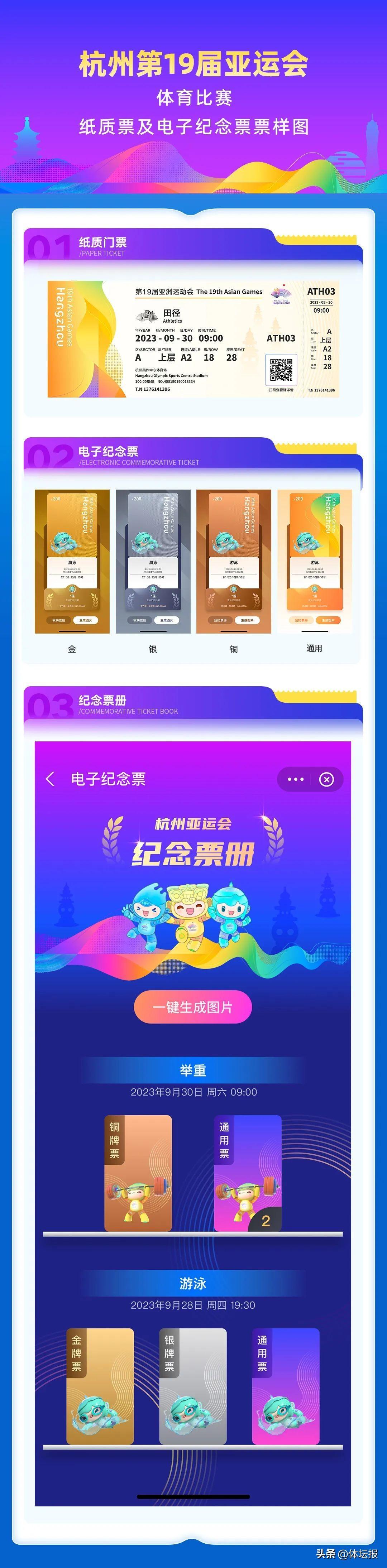 爲呼籲全民助力綠色亞運,杭州亞運會推薦使用電子票,這也是電子紀念票和專屬電子票冊首次運用於國內舉辦的綜合性運動會,是智能辦賽理念的生動體現。凡購買電子票的用戶均可在公衆售票官網H5頁面、智能亞運一站通·票務通票夾中抽取對應項目的電子紀念票,生成專屬票冊。電子紀念票分金、銀、銅、通用四種類型,抽中比例分別爲5%、10%、15%、70%。