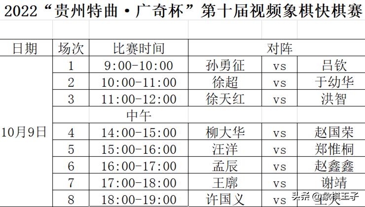 北京時間10月9日、10日,2022年廣奇盃第十屆視頻象棋快棋賽將在廣東廣州展開兩天超級大戰。王天一、鄭惟桐、呂欽、柳大華、趙國榮、徐天紅、於幼華、洪智、趙鑫鑫、汪洋、徐超、謝靖、孫勇徵、王廓、孟辰、許國義,十六位頂尖棋王、特大火線爭鋒,全快棋閃電拼奪,6+3’,分先二局,激烈不已,驚心動魄,第十屆王冠歸屬於誰,快棋霸主鹿死誰手,象棋王子也將全程直播,見證十冠金盃誕生。