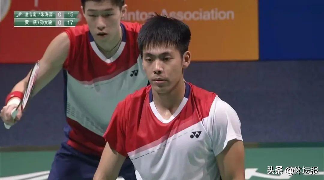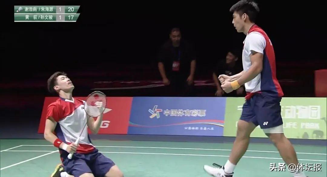 男雙決賽是當日最後一個項目,一個月前在全國單項冠軍賽奪冠的謝浩南/朱海源在主場遇見江蘇組合黃荻/孫文駿,這對組合在比賽中敢打敢拼,失誤也很少,戰術針對性強,曾在今年的羽超聯賽中讓王昶這樣的國家隊成員都難以對付。果然,首局雙方就打出相持局,多組多拍對決也讓比分交替上升,但在最後時刻,江蘇組合連續關鍵得分,浙江18:21先失一局。