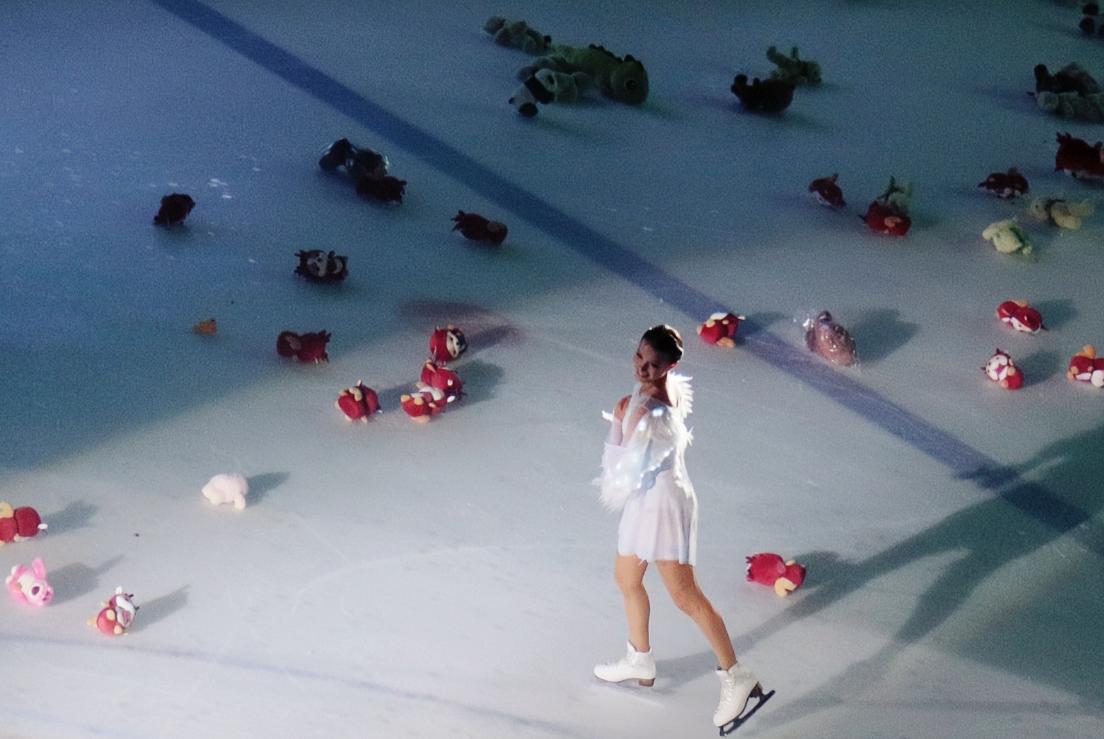 19歲的謝爾巴科娃如同純潔天使,優雅謝幕,短暫的五分鐘表演滑,真的很多人都看不夠,當音樂停止時,冰迷們爲謝爾巴科娃奉上了鮮花和玩偶,鋪天蓋地,四面八方的娃娃雨從二樓灑下,場面頗爲震撼。隨後,“小千金”還在現場接受了採訪,她的滑冰服也亮起了光帶,看上去更像一個天使了!