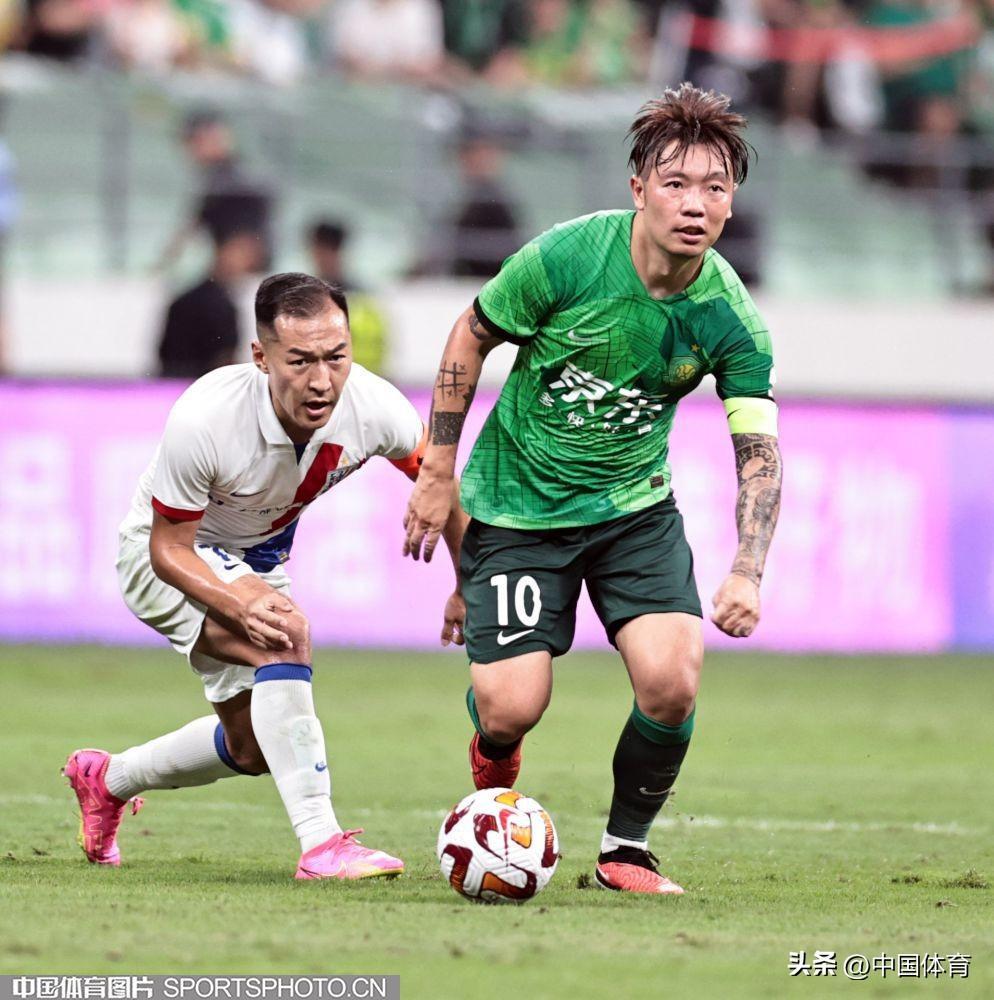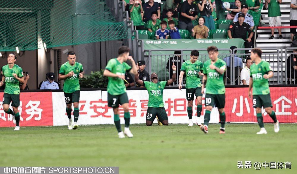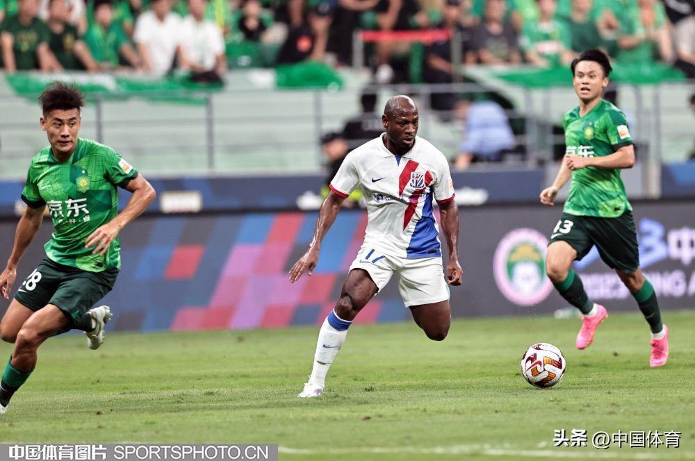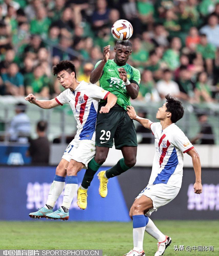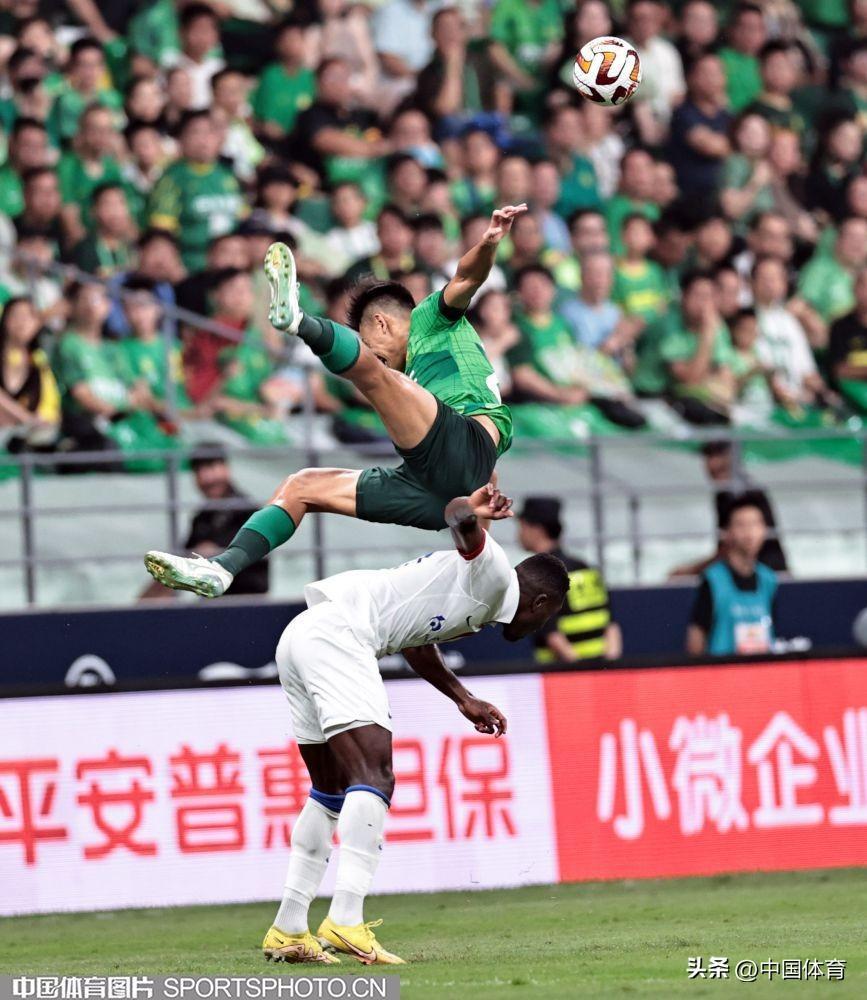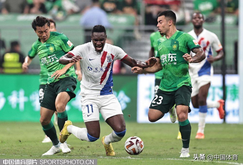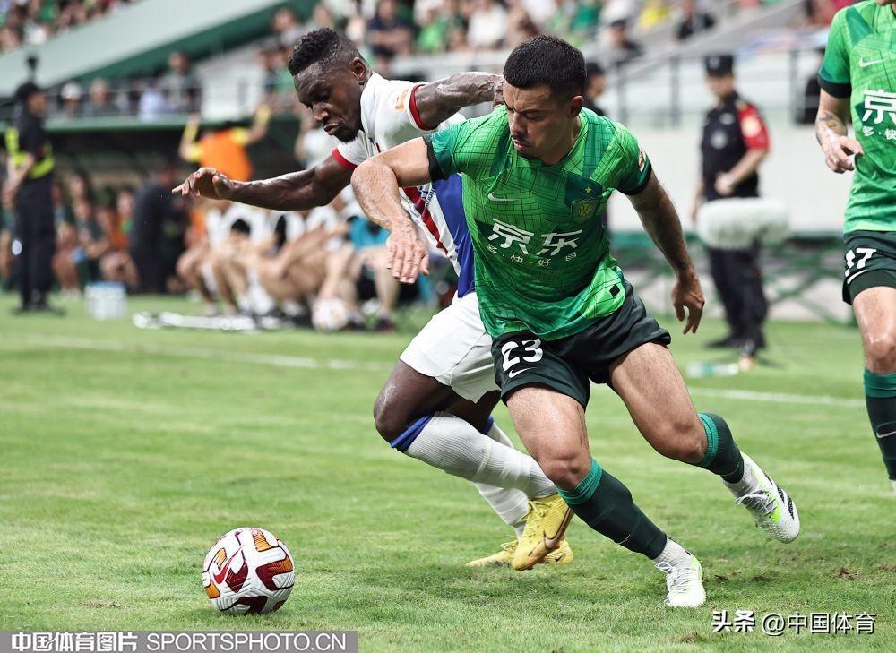 中國體育訊 8月19日晚,2023賽季中超聯賽繼續第二十三輪爭奪。在北京工人體育場,主場作戰的北京國安隊(綠衣)在開場不久就先失一球的不利局面下,憑藉外援射手法比奧上半場第28分鐘的推射破門和第37分鐘的頭球破門,以2比1逆轉上海申花隊(白衣),取得在工體主場對陣申花的11連勝。本場比賽,也是北京國安隊史的第1000場比賽。(中國體育圖片 王憲民 攝)