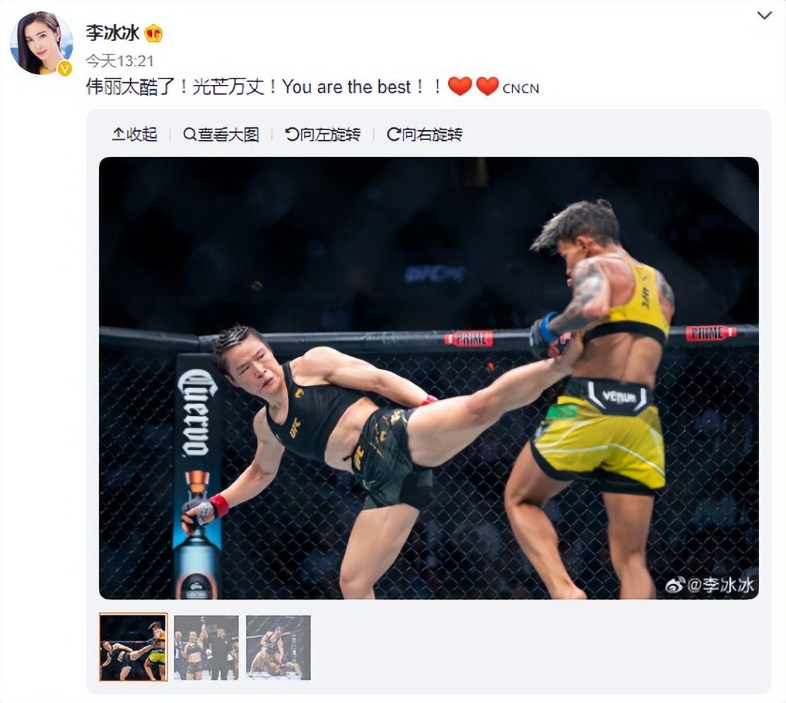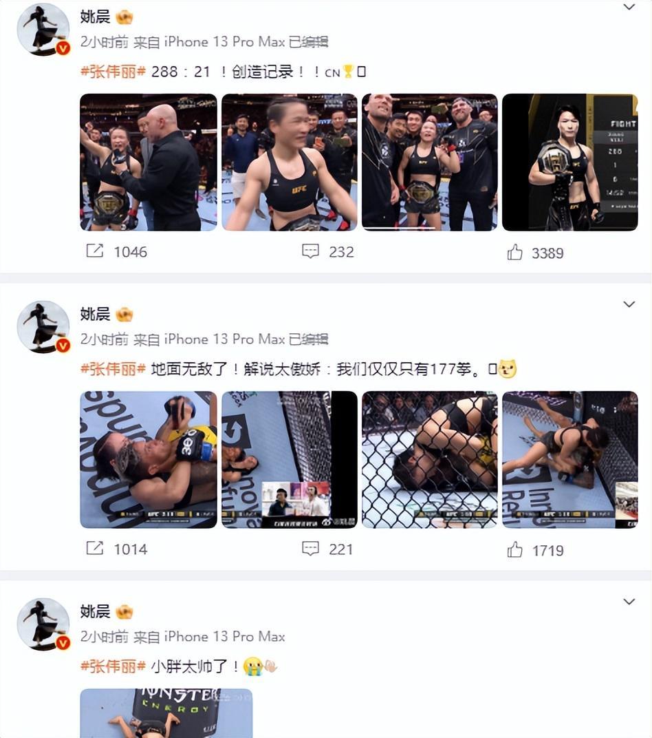 除了李冰冰,姚晨也送上了祝福,她在短短7分鐘的時間,連續發佈3條狀態,分別寫下:“小胖太帥了!”、“地面無敵了,解說太傲嬌:我們僅僅只有177拳。”、“288:21 !創造記錄!”看得出來,姚晨是在屏幕前全程觀看了張偉麗的比賽,真愛無疑了。