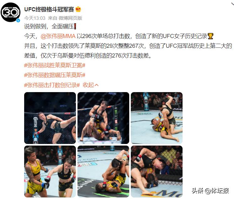 本場比賽,張偉麗的表現可以用“說到做到,全面碾壓”評價。張偉麗以296次單場總打擊數,創造了新的UFC女子歷史紀錄。