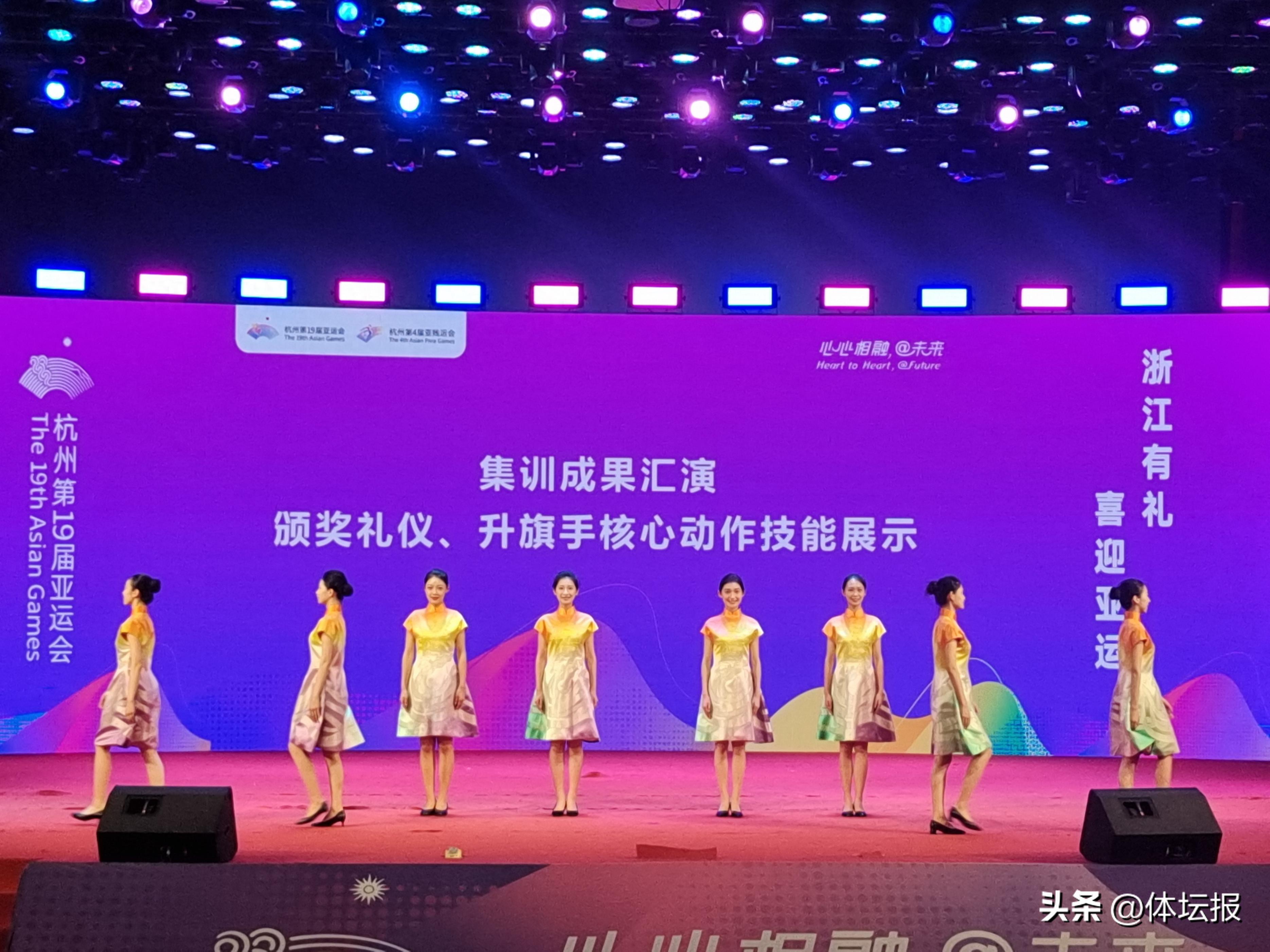 從培訓班“畢業”後,全體頒獎禮儀、升旗手繼續按照培訓要求自行嚴格訓練,並且將進入場館演練期,分組進入競賽場館配合開展演練測試等工作,與場館進一步磨合,以更好狀態全力迎接亞運盛會的到來。賽時預計全體頒獎禮儀、升旗手將服務亞運會、亞殘運會頒獎儀式1049場。
