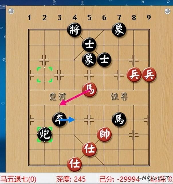 此下,表面看和勢甚濃,實則黑方暗藏殺機,蔣川殘棋功夫深厚,黑方一個躍馬撲左線,雙炮佔肋路,讓紅方情急之下,不知如何防守。