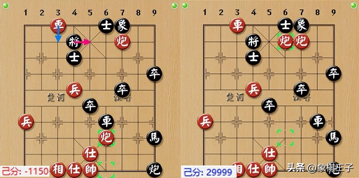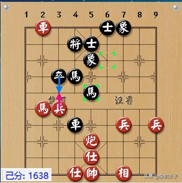 紅103手兵七進一,衝兵過去,兼馬踩黑車,黑方逃車,紅兵七平六靠,一兵喫雙馬,加馬八進七,高吊馬殺,黑已敗定。