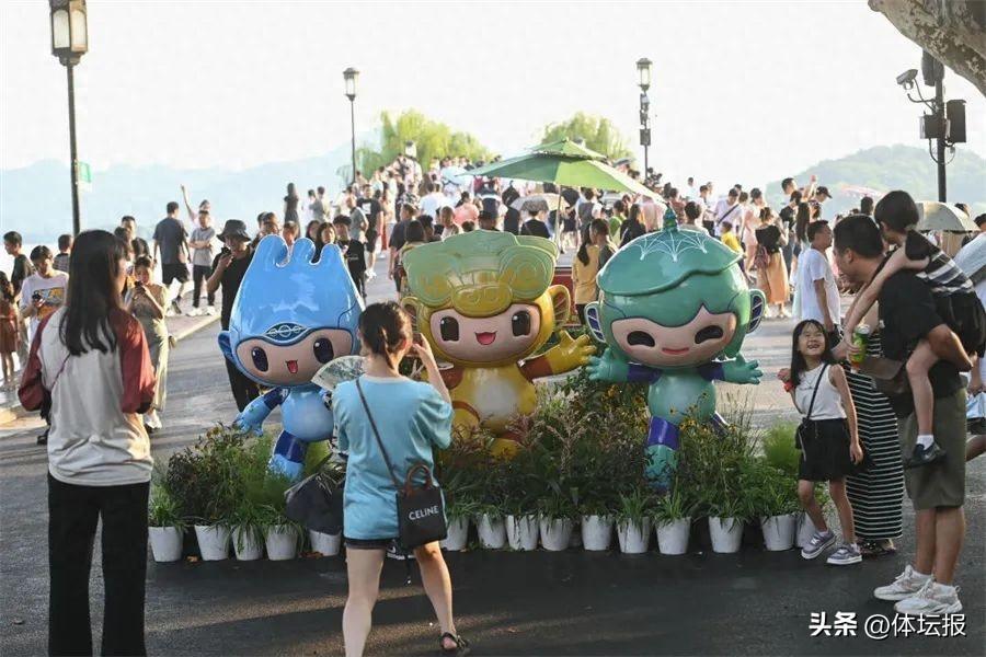 遊客在位於杭州西湖景區的斷橋邊與杭州亞運會吉祥物合影(2023年8月21日攝)。新華社記者 黃宗治 攝