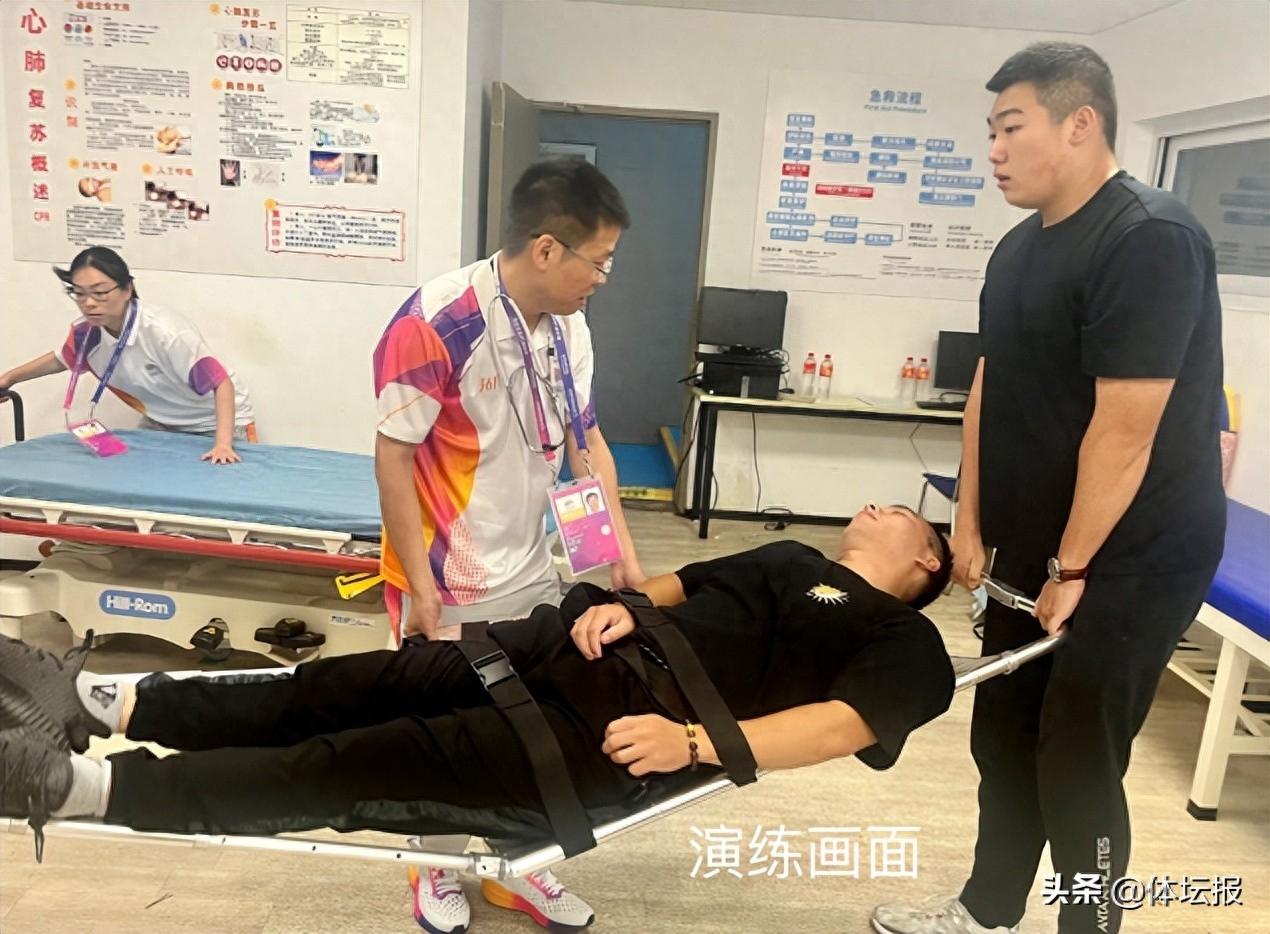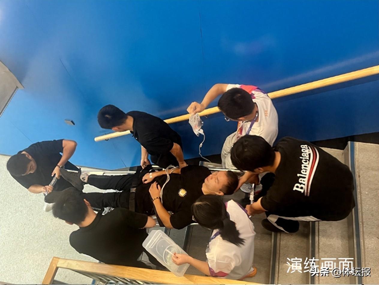 “緊急搶救的演練馬上開始,請各方面做好準備”隨着場館內各處對講機連線聲音的忙碌起來,9:45,救護演練準時開始。在“受傷運動員”倒地的一分鐘內,從“目擊者”場館訓練員第一時間通知,到之後接連趕來的醫護人員做緊急救護,擔架操作人員抬起擔架將“受傷運動員”送往醫療間,搶救行動”有條不紊開展。